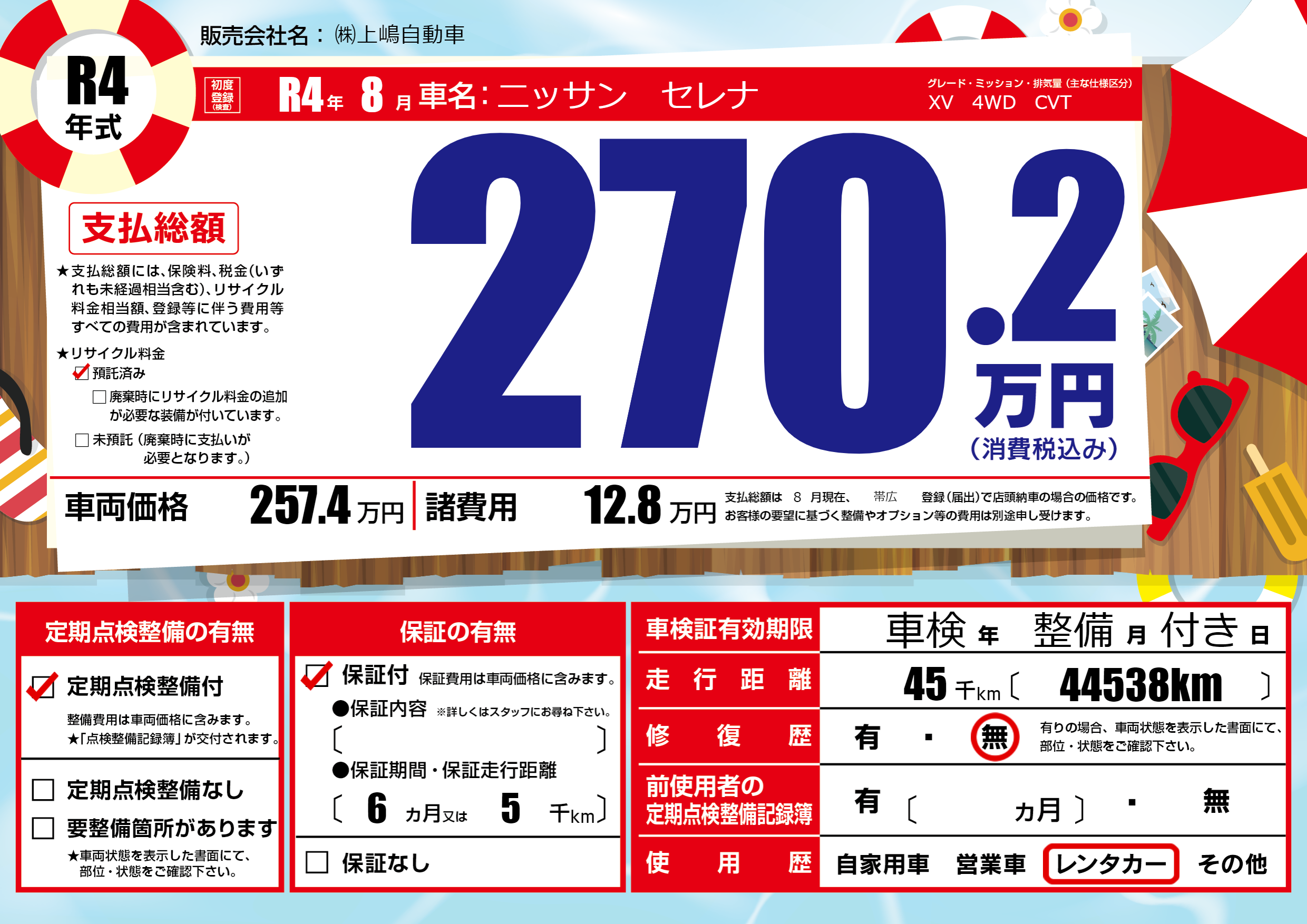 | 車名 | ニッサン セレナ | グレード ミッション 排気量 |