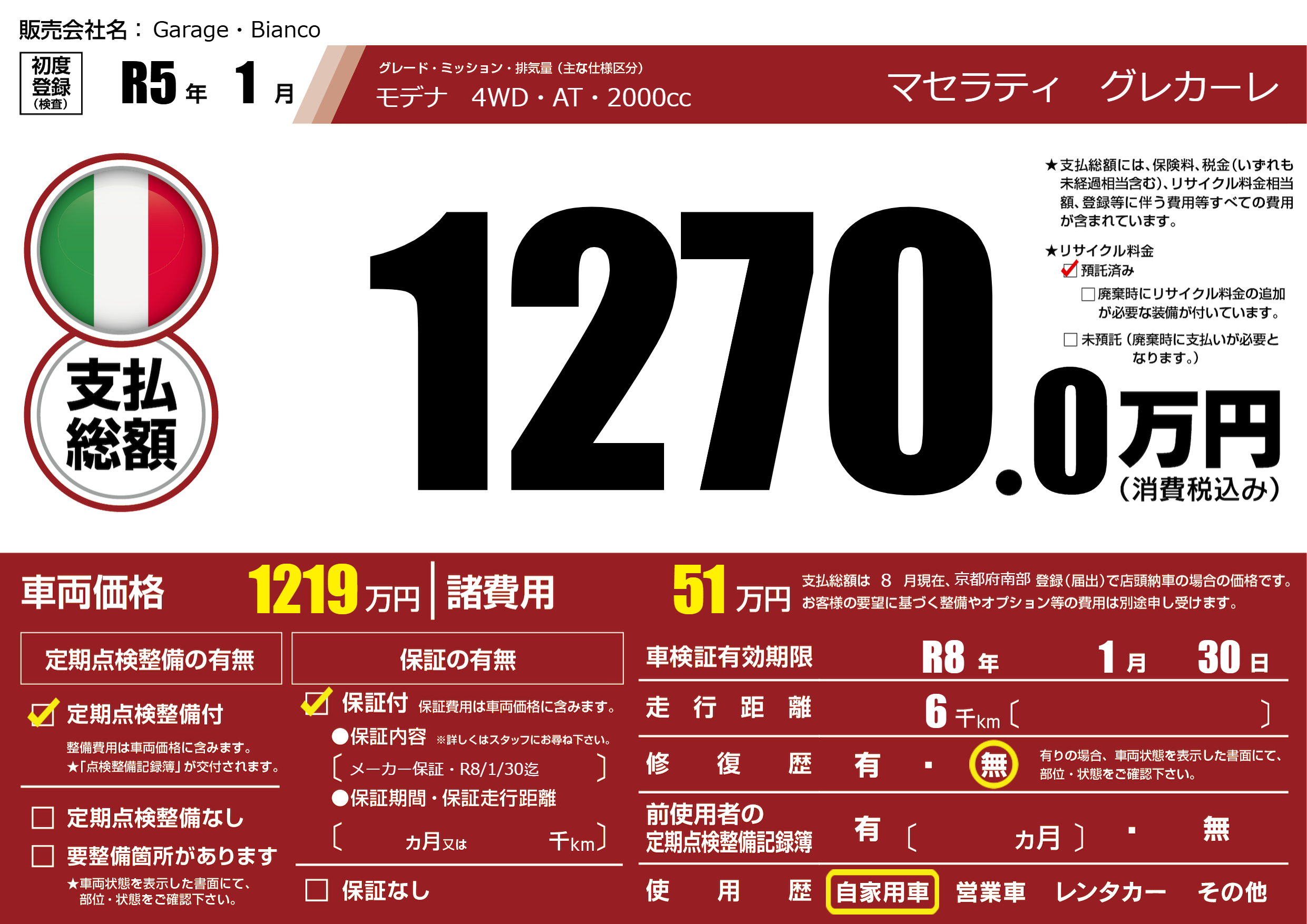 | 車名 | マセラティ グレカーレ | グレード ミッション 排気量 |