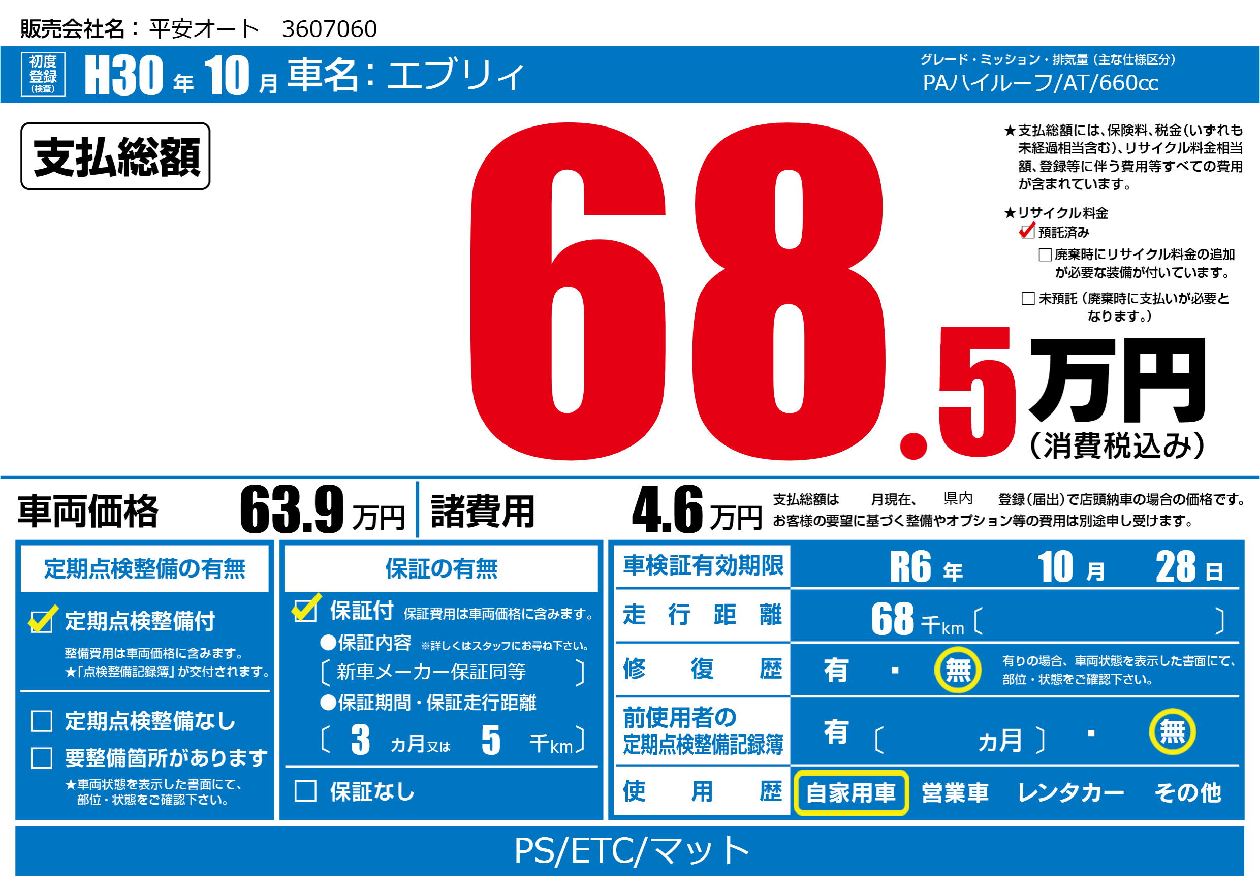 | 車名 | エブリィ | グレード ミッション 排気量 |