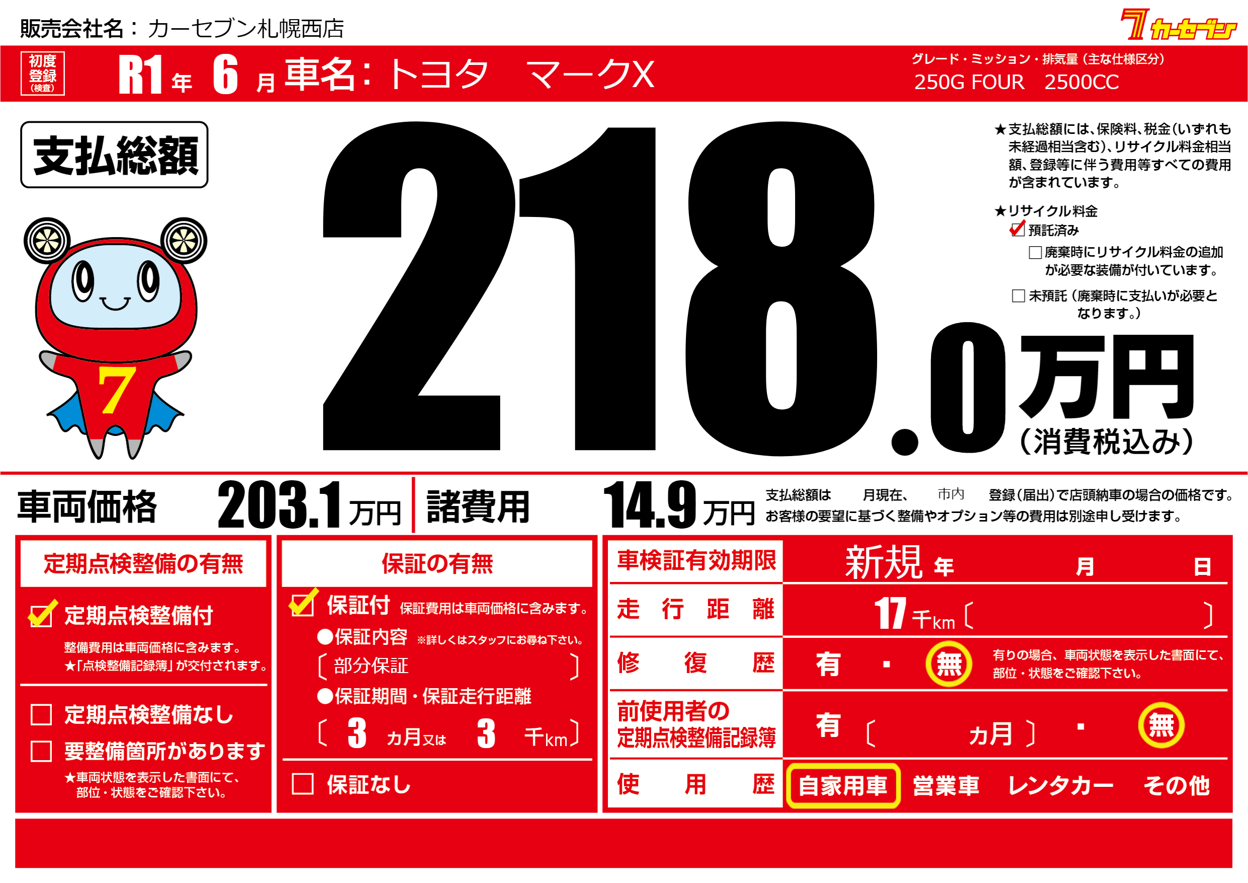 | 走行キロ | 1.7万km | 初年度登録 | R1年6月 |