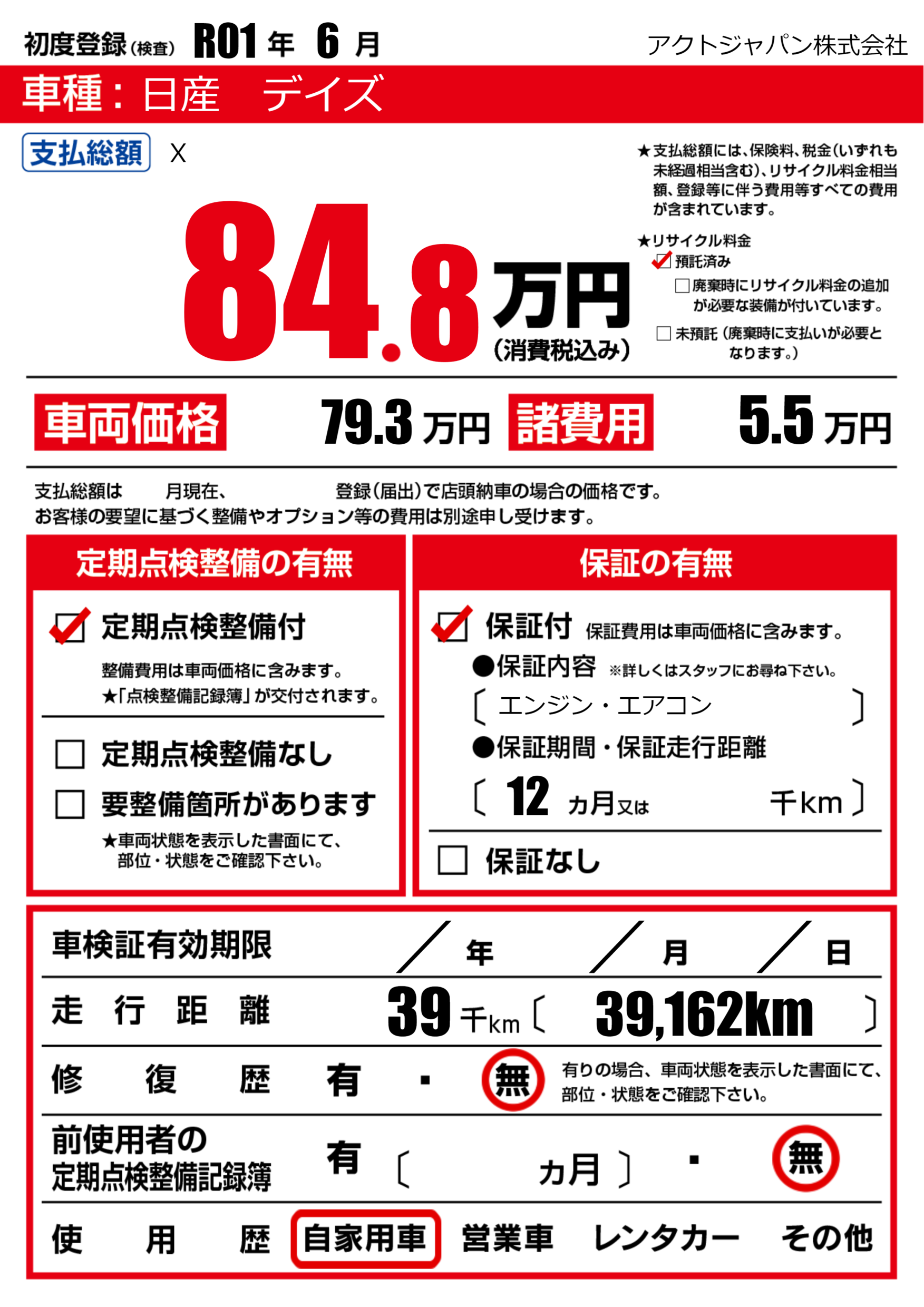 | 走行キロ | 3.9万km | 初年度登録 | R01年6月 |