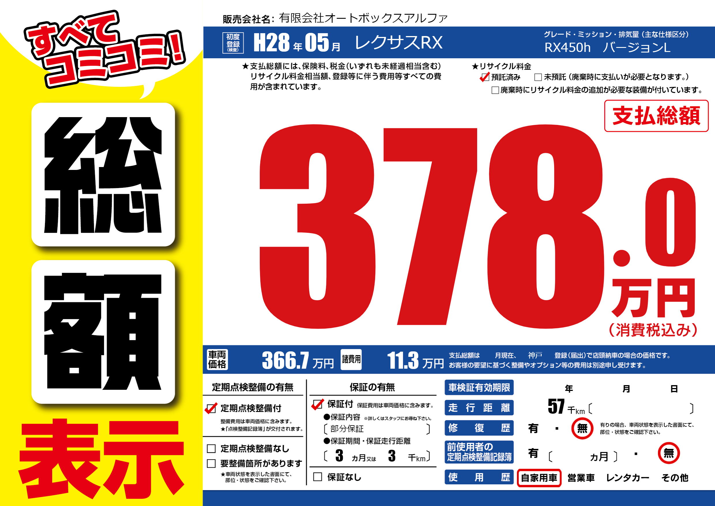 | 車名 | レクサスRX | グレード ミッション 排気量 |