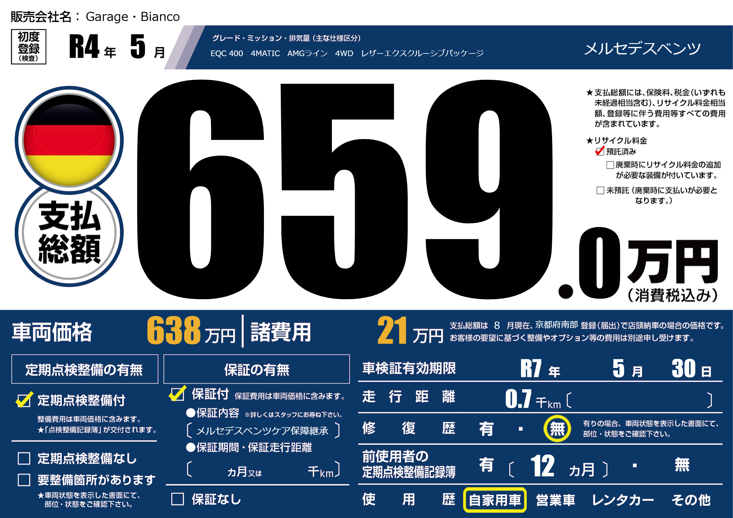 EQC 400 4MATIC AMGライン 4WD レザーエクスクルーシブパッケージ |
