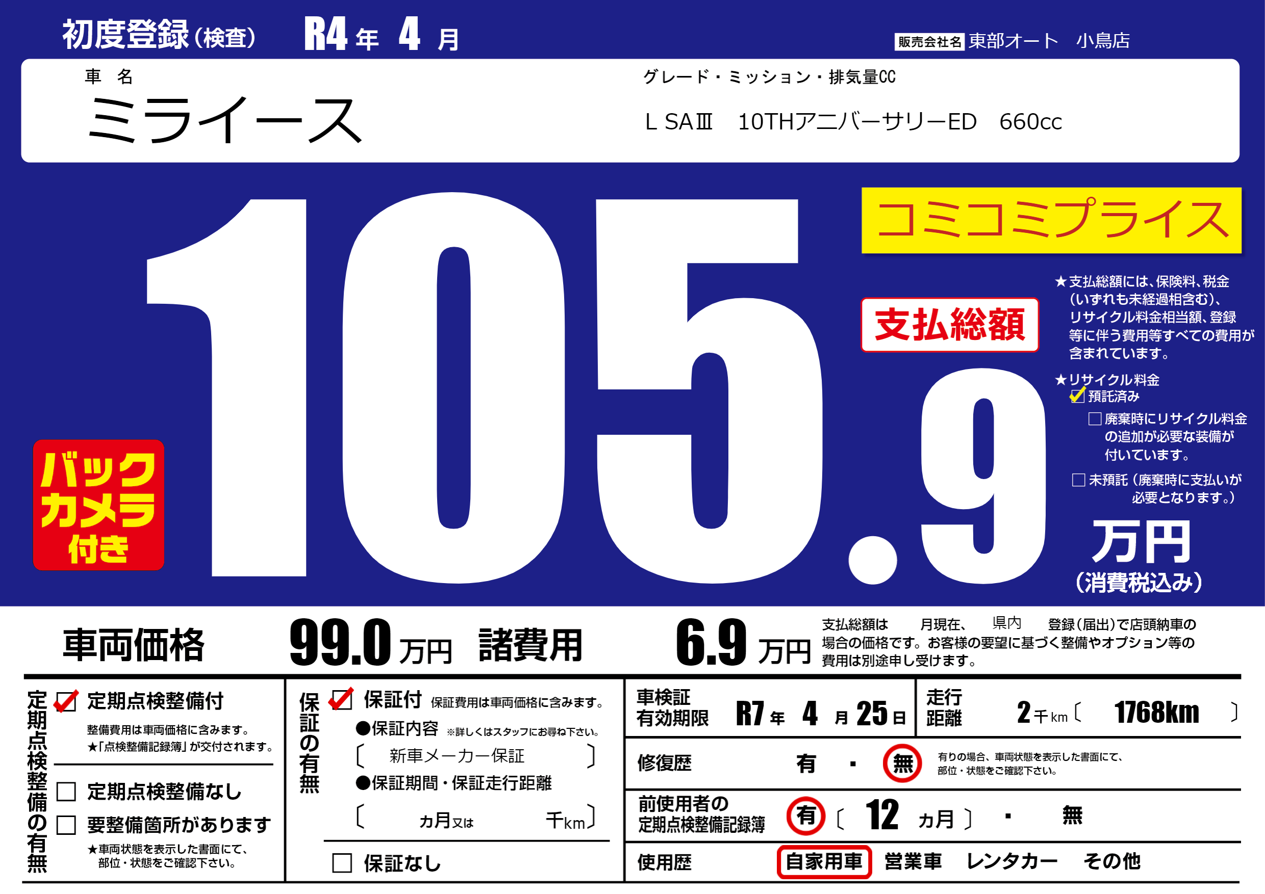 | 車検制限 | R7年 4月 25日 | ||