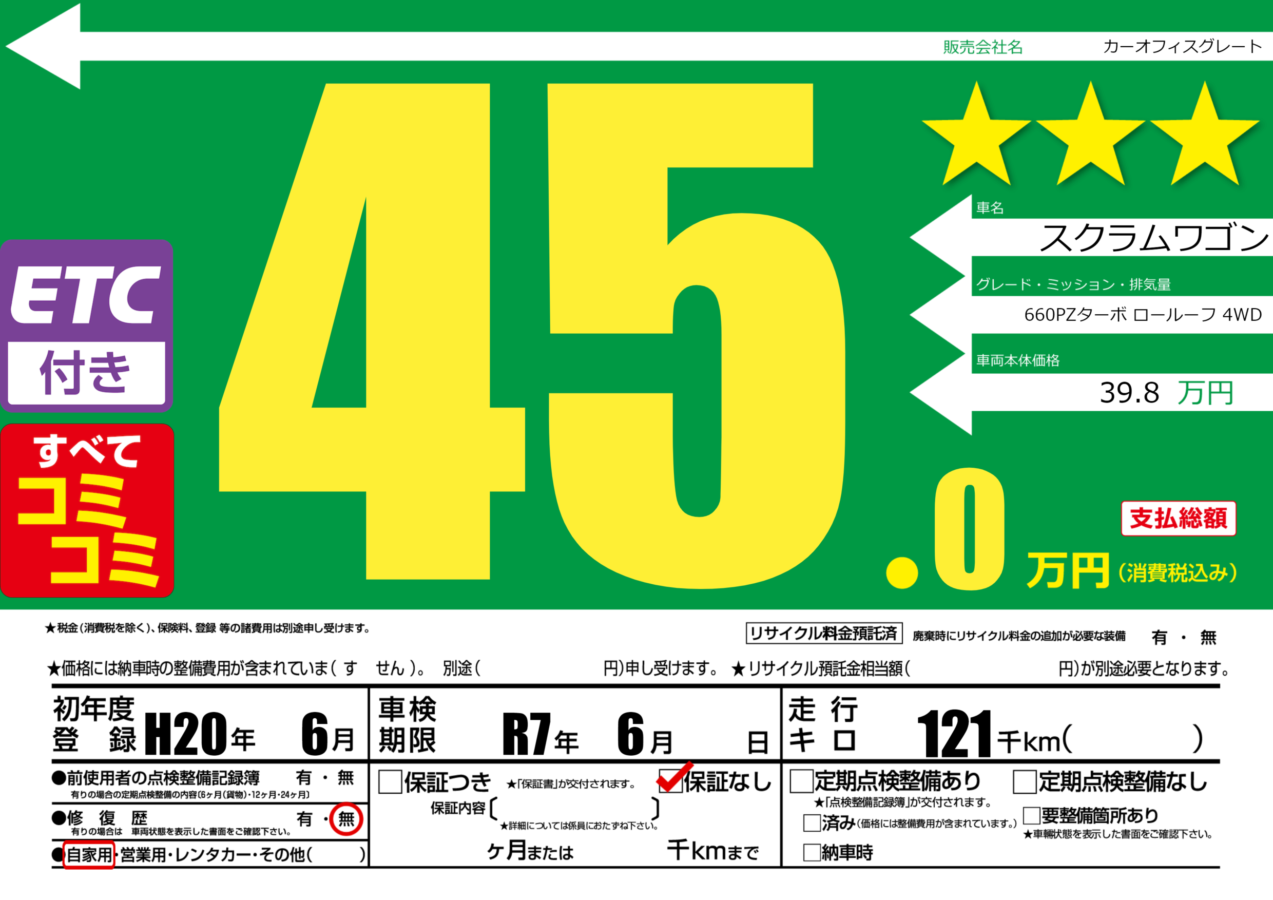 | 走行キロ | 12.1万km | 初年度登録 | H20年6月 |