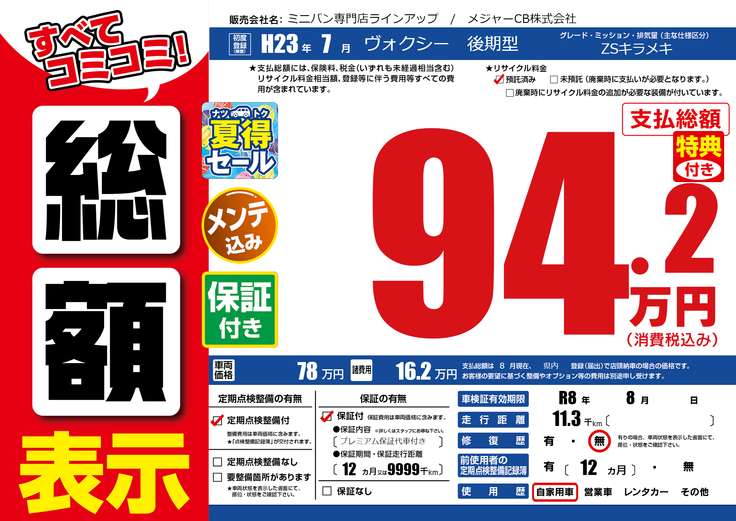 | 車名 | ヴォクシー 後期型 | グレード ミッション 排気量 |