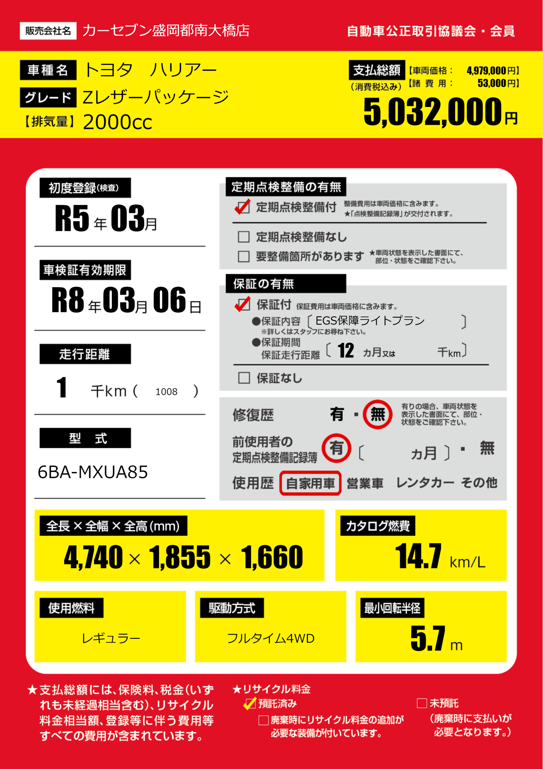 | 走行キロ | 0.1万km | 初年度登録 | R5年03月 |