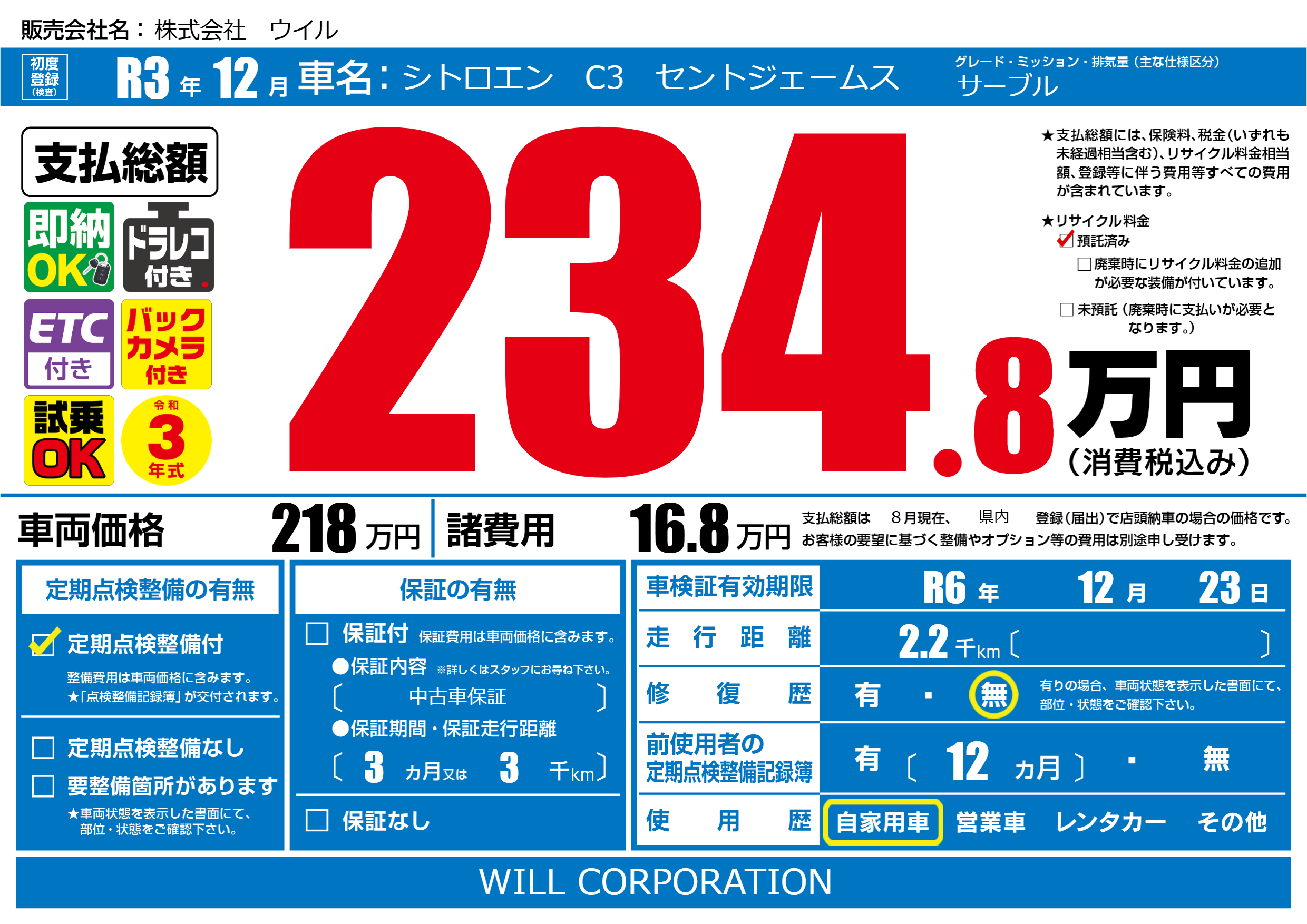 | 走行キロ | 0.2万km | 初年度登録 | R3年12月 |