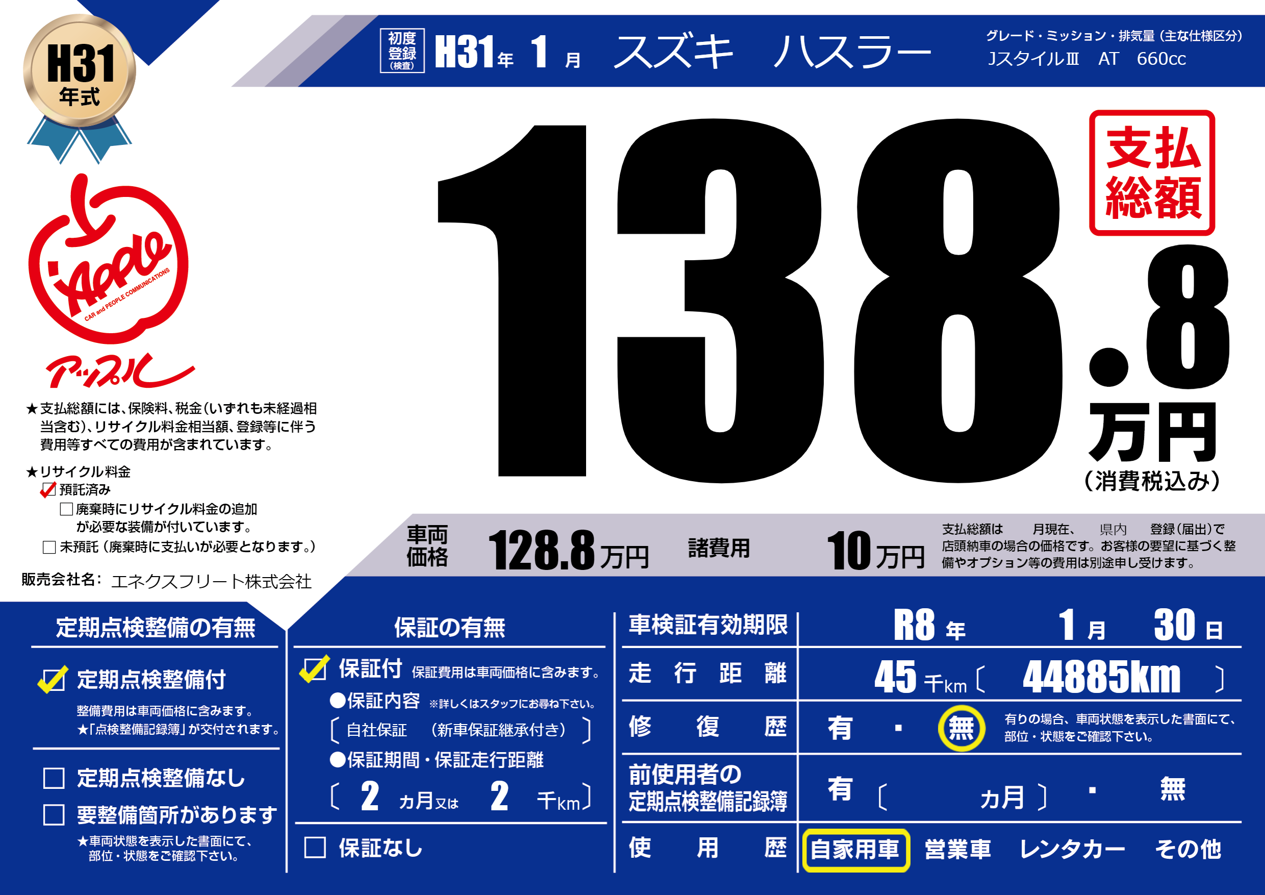 | 車名 | スズキ ハスラー | グレード ミッション 排気量 |