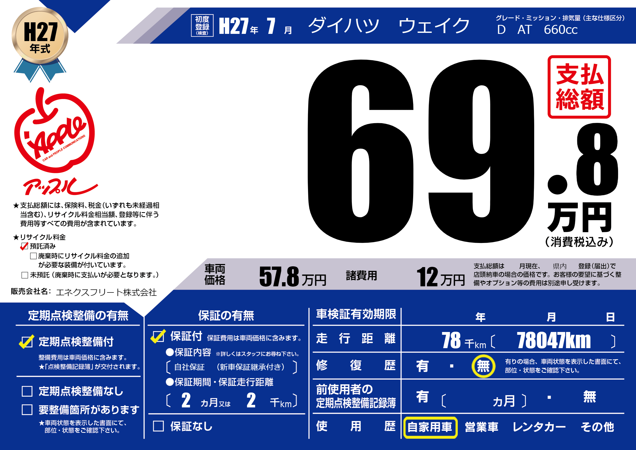 | 走行キロ | 7.8万km | 初年度登録 | H27年7月 |