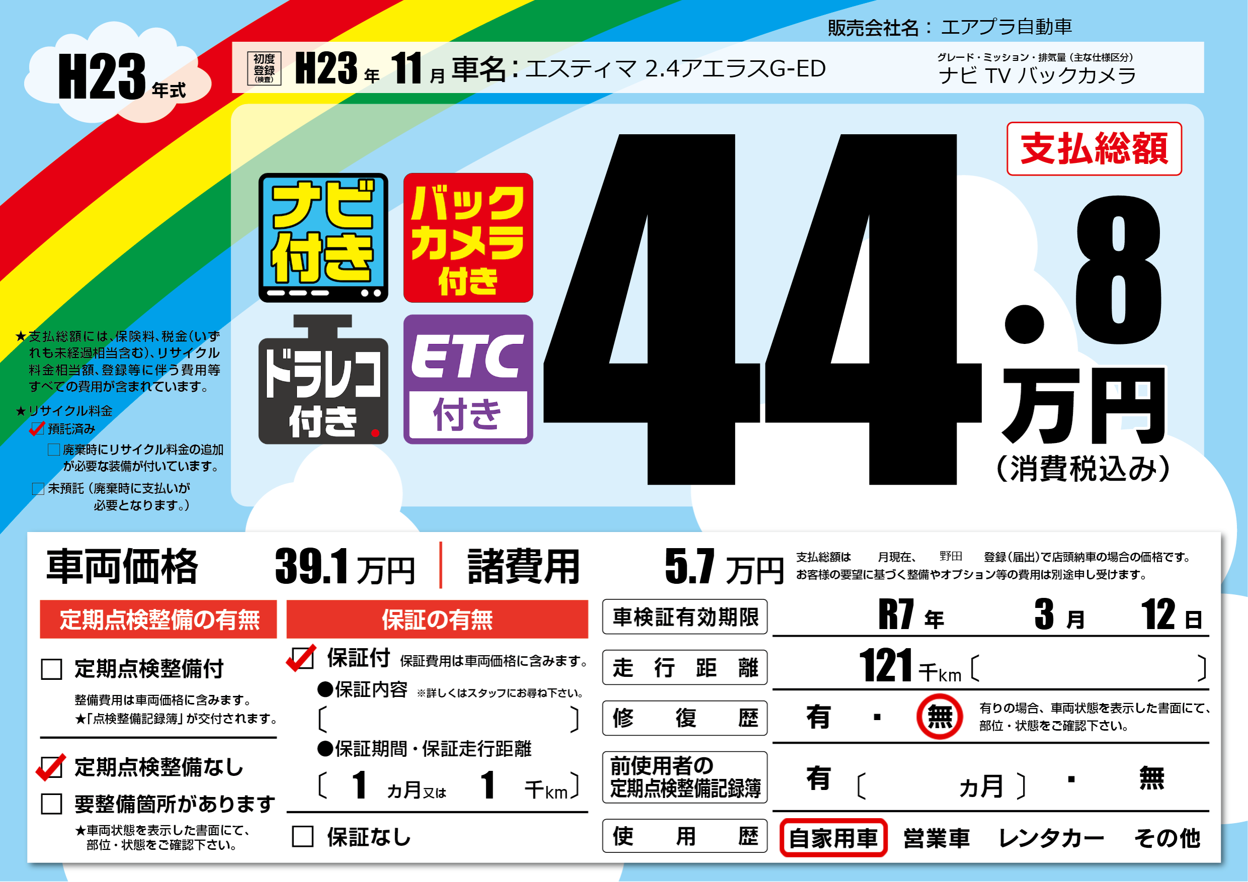 | 車検制限 | R7年 3月 12日 | ||
