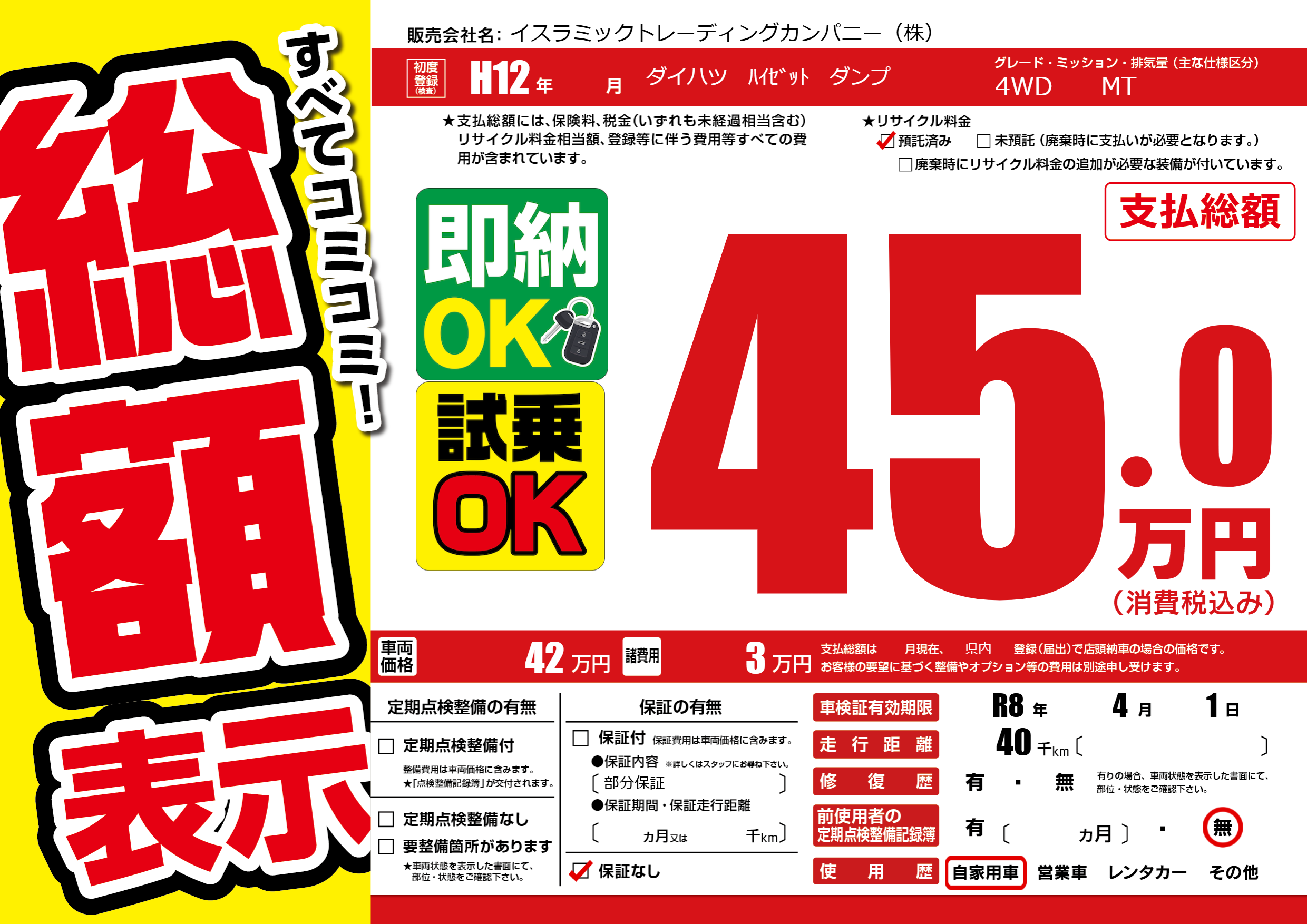 | 走行キロ | 4万km | 初年度登録 | H12年---月 |