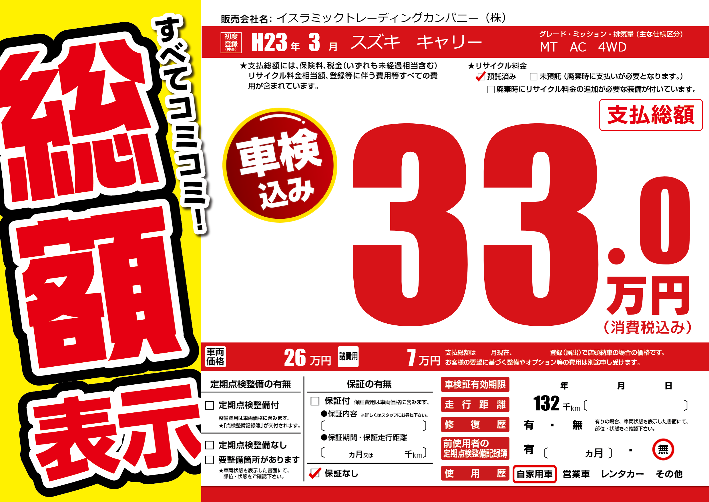 | 走行キロ | 13.2万km | 初年度登録 | H23年3月 |