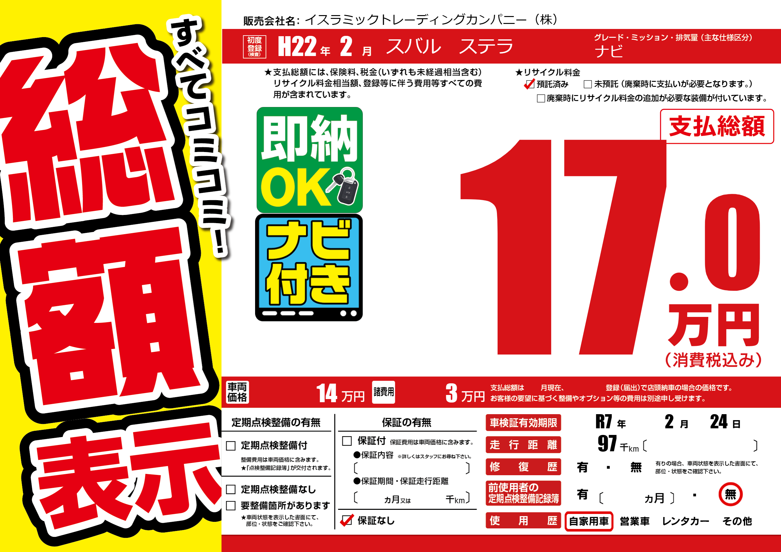| 車名 | スバル ステラ | グレード ミッション 排気量 |