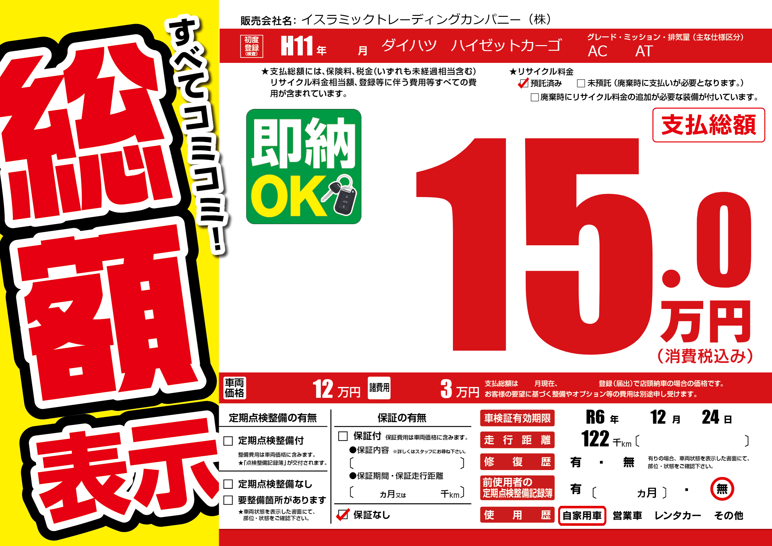 | 車名 | ダイハツ ハイゼットカーゴ | グレード ミッション 排気量 |