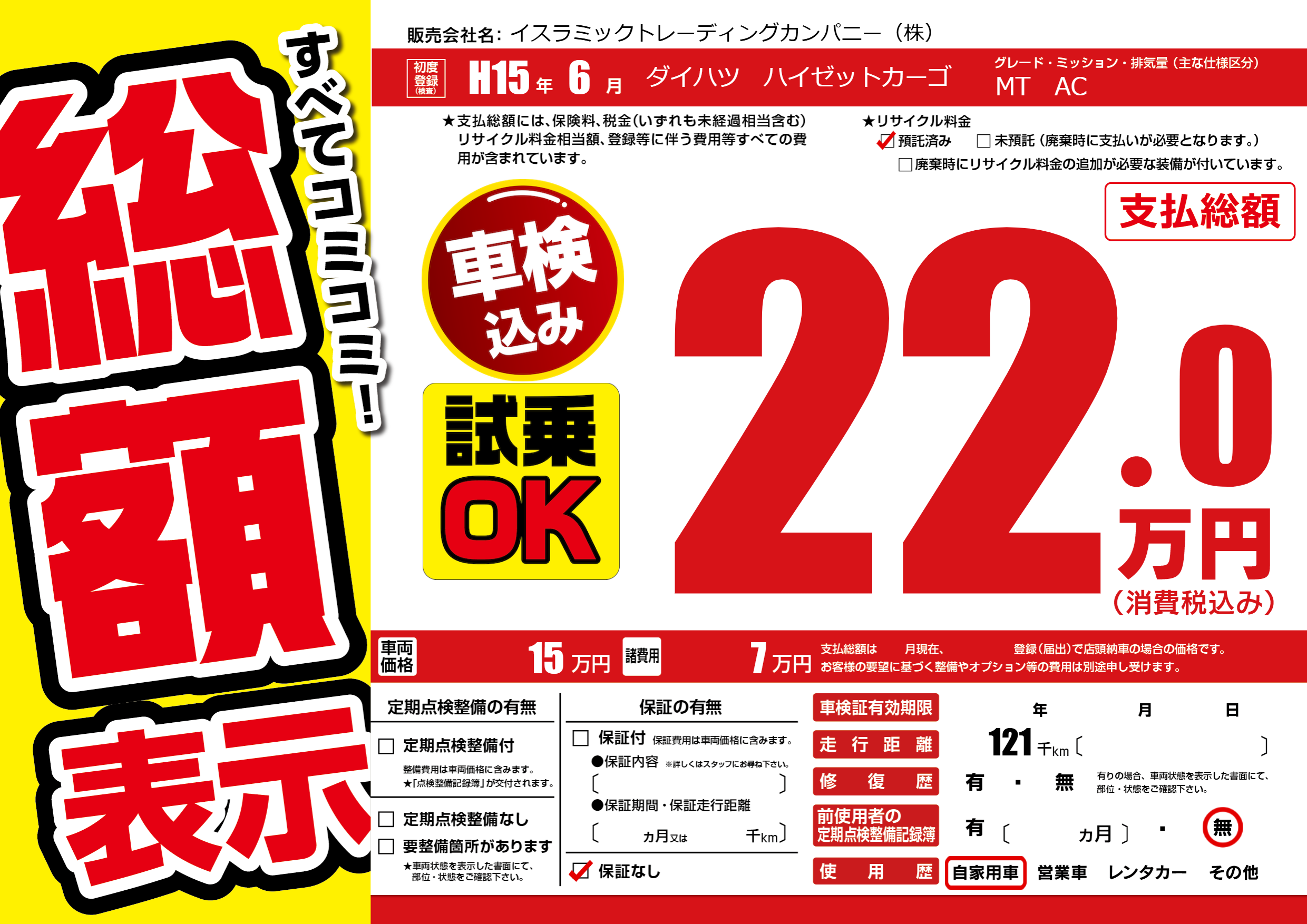 | 走行キロ | 12.1万km | 初年度登録 | H15年6月 |