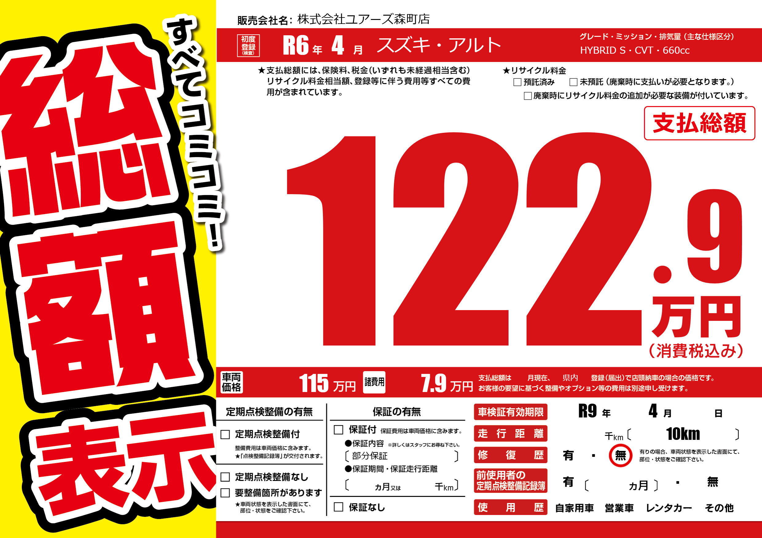 | 車名 | スズキ・アルト | グレード ミッション 排気量 |