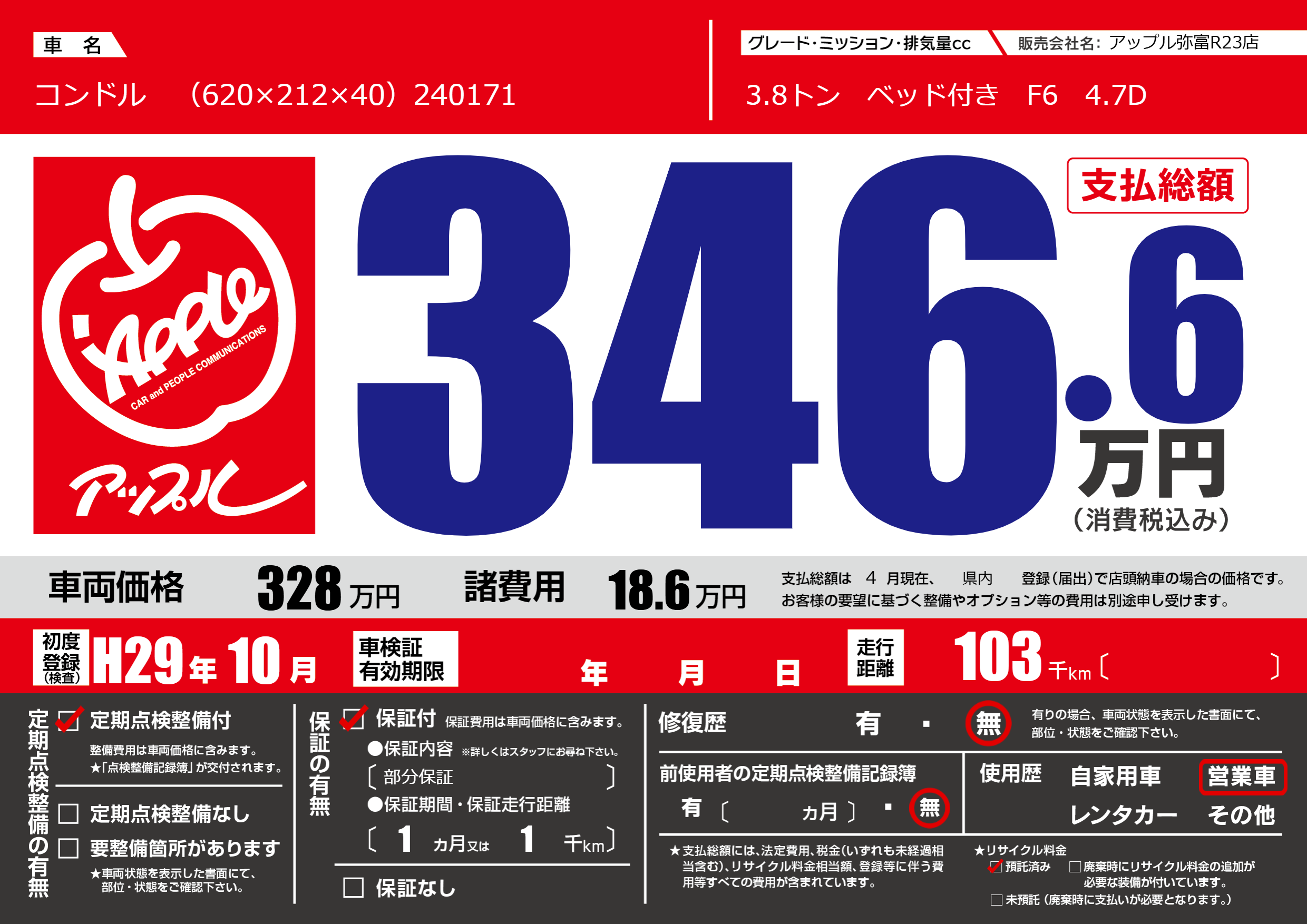 | 車名 | コンドル (620×212×40)240171 | グレード ミッション 排気量 |