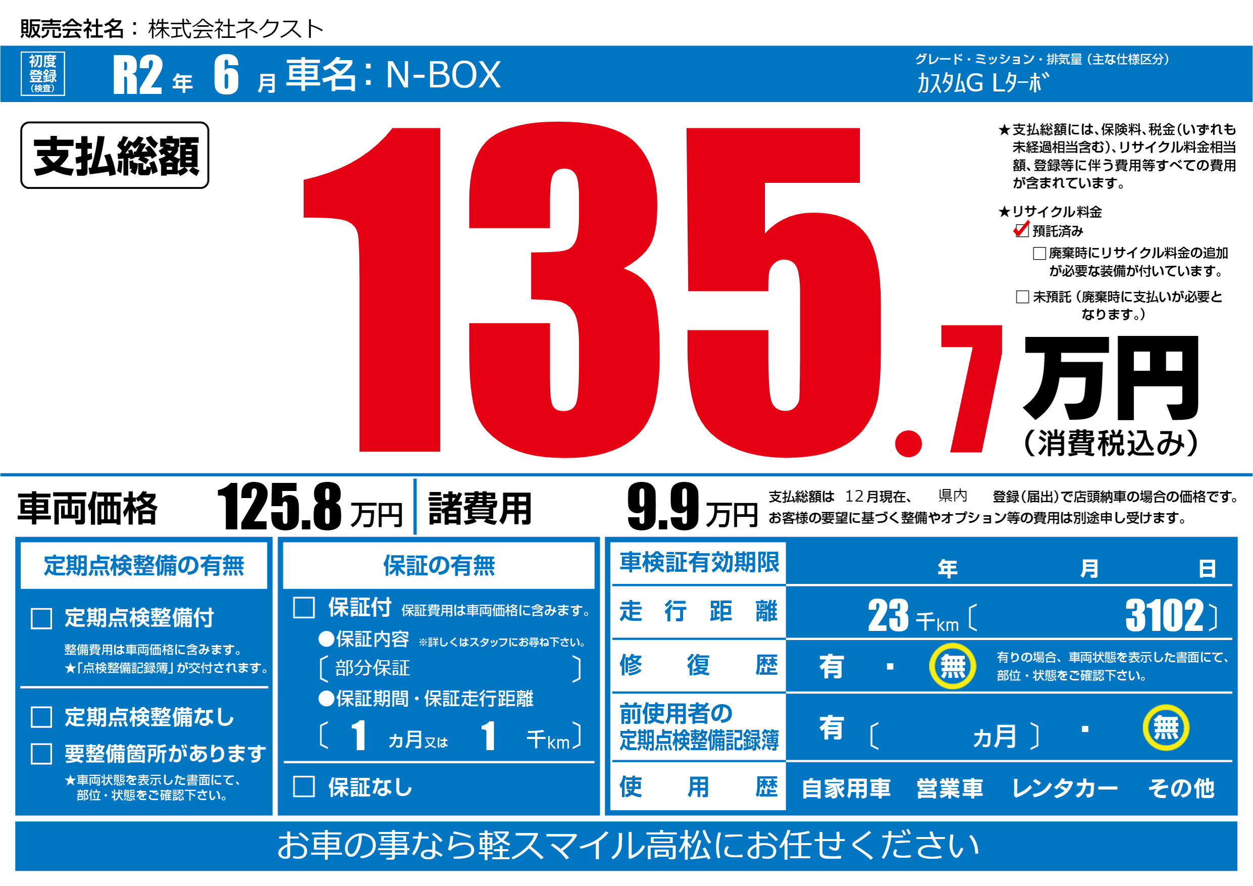 | 走行キロ | 2.3万km | 初年度登録 | R2年6月 |