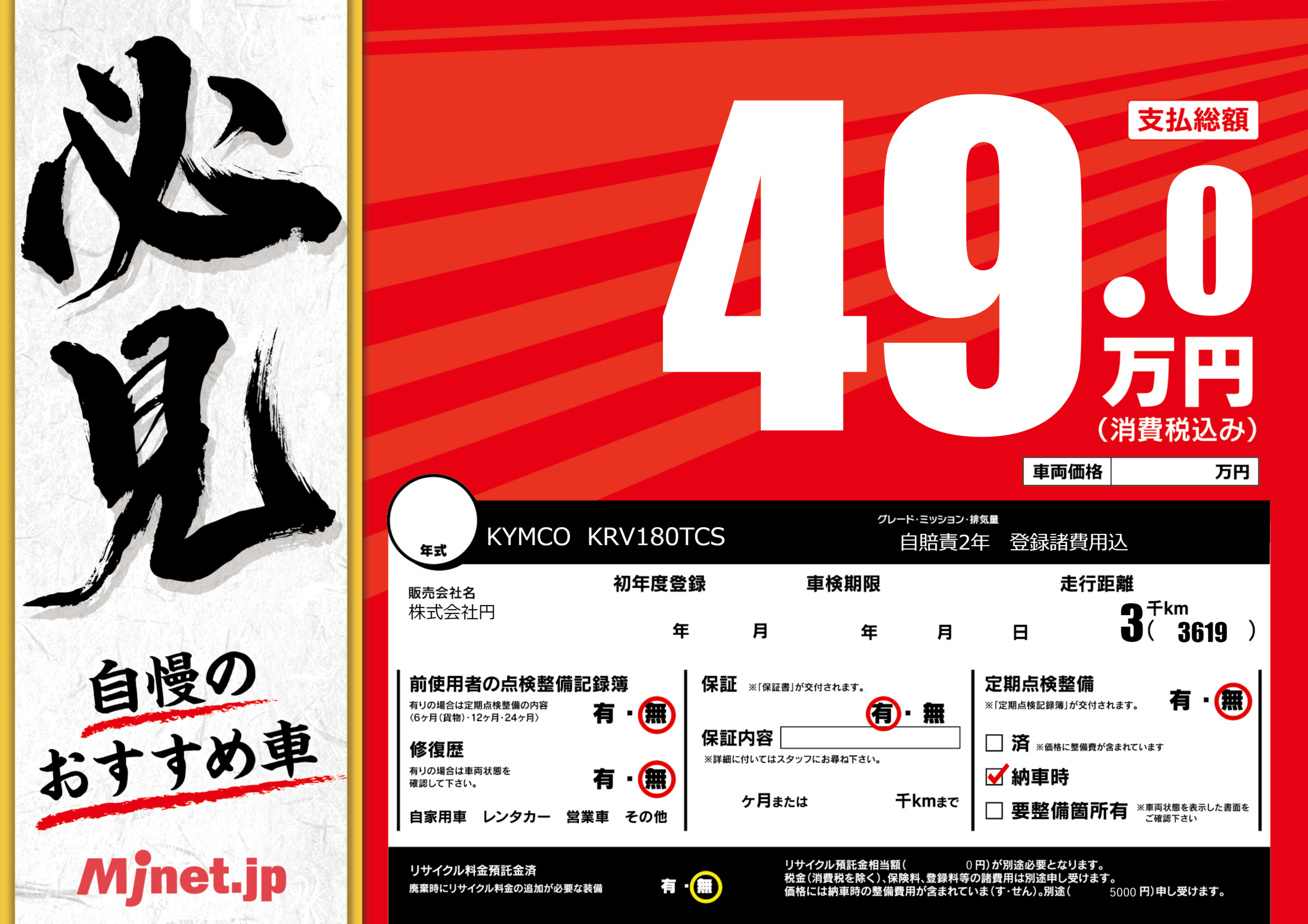 | 車名 | KYMCO KRV180TCS | グレード ミッション 排気量 |