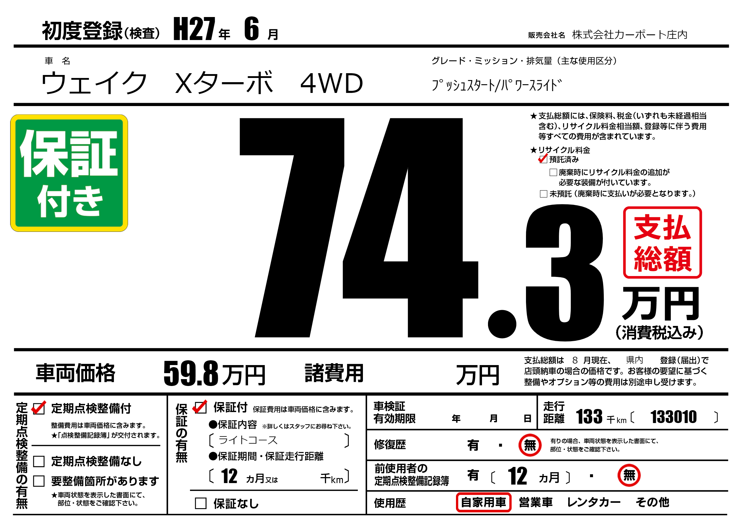 | 車名 | ウェイク Xターボ 4WD | グレード ミッション 排気量 |