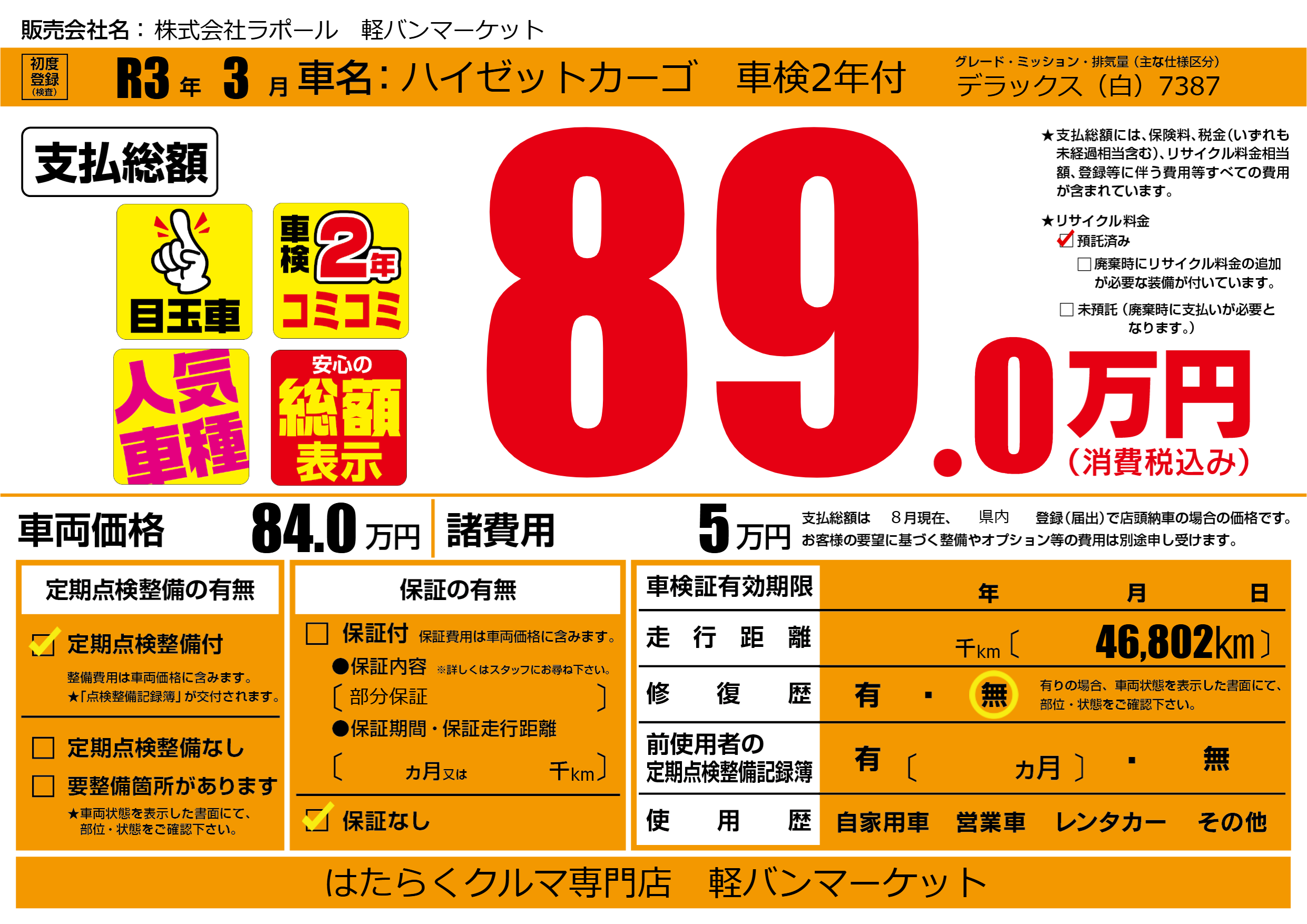 | 車名 | ハイゼットカーゴ 車検2年付 | グレード ミッション 排気量 |