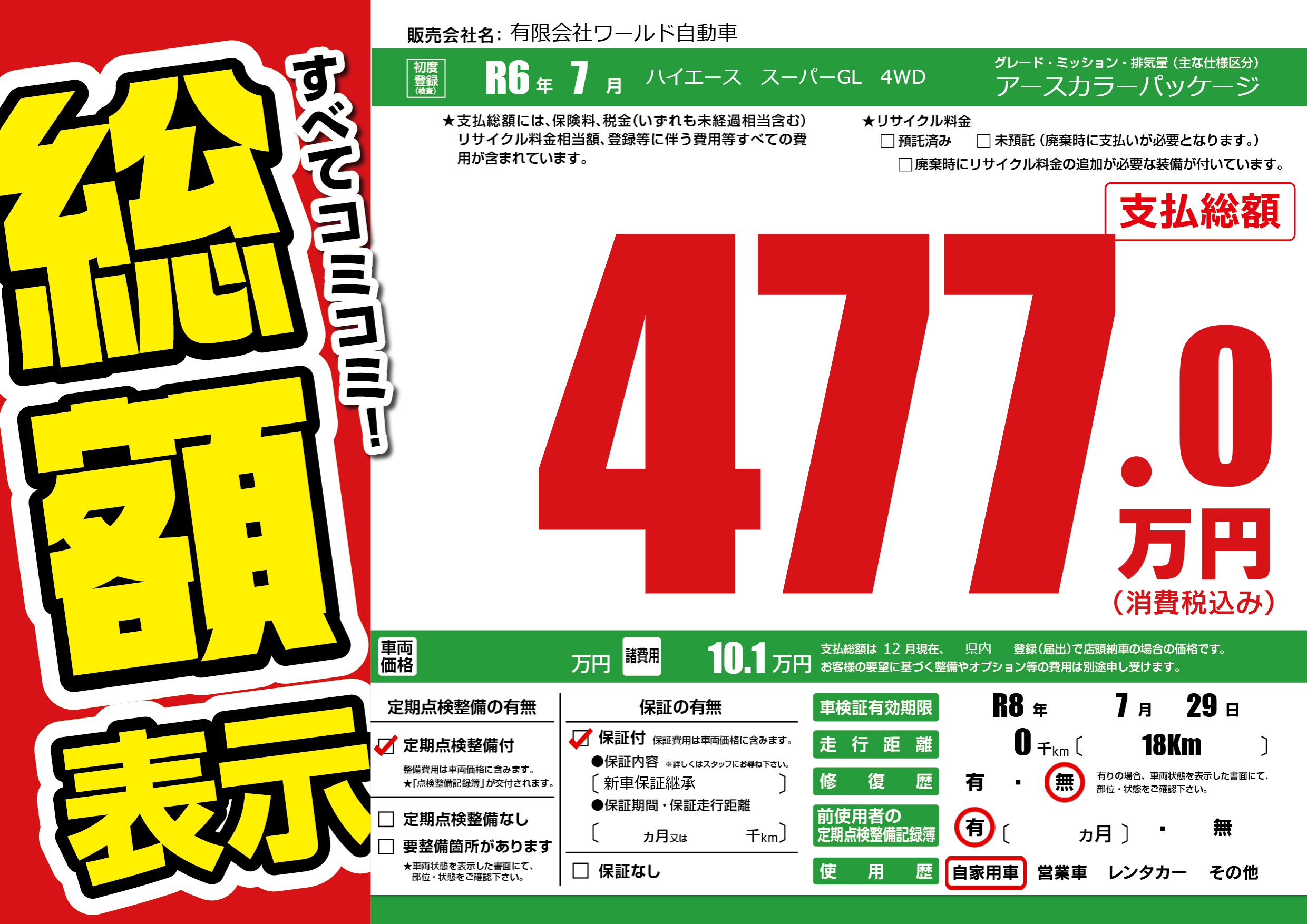 | 車名 | ハイエース スーパーGL 4WD | グレード ミッション 排気量 |