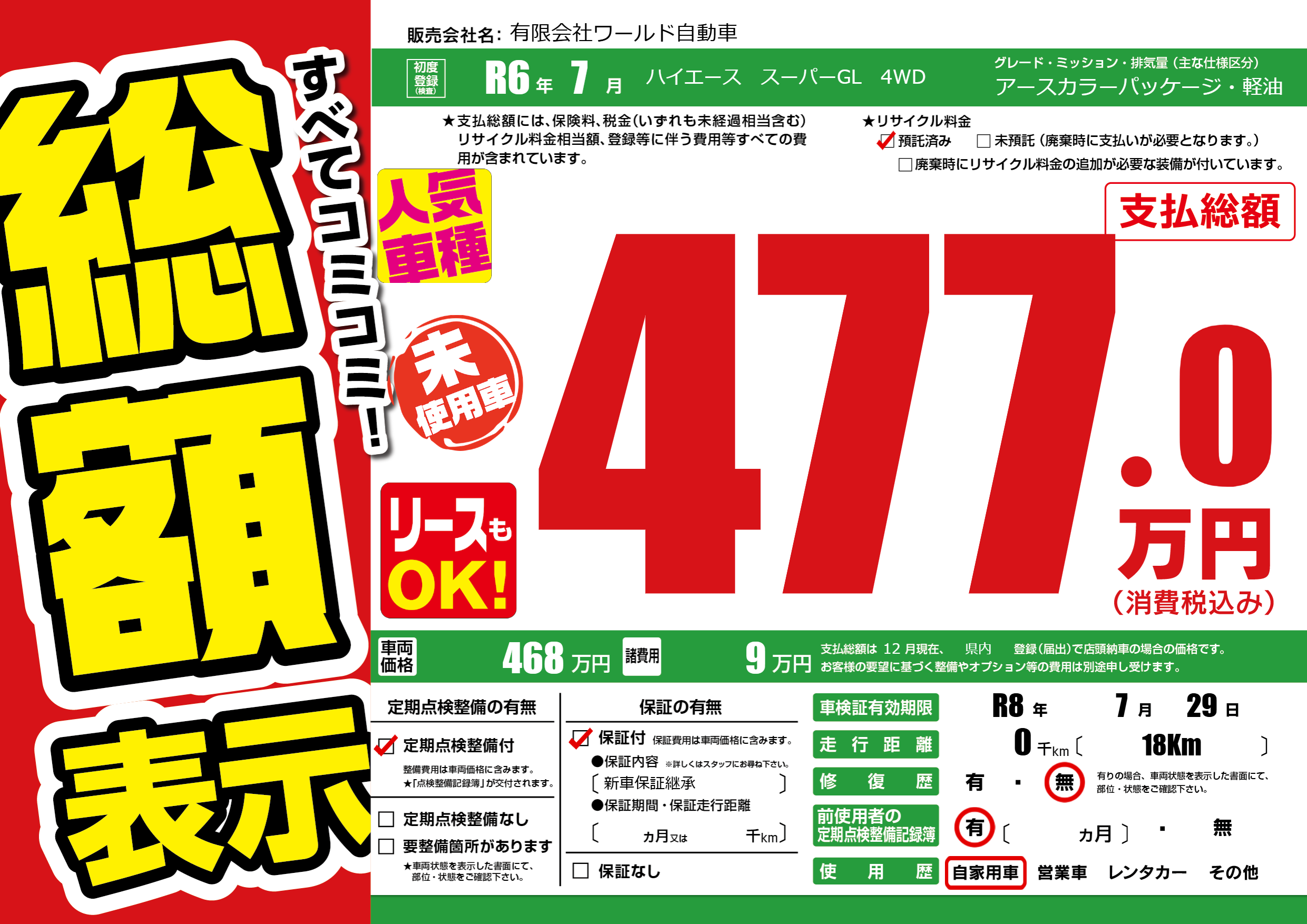| 車名 | ハイエース スーパーGL 4WD | グレード ミッション 排気量 |