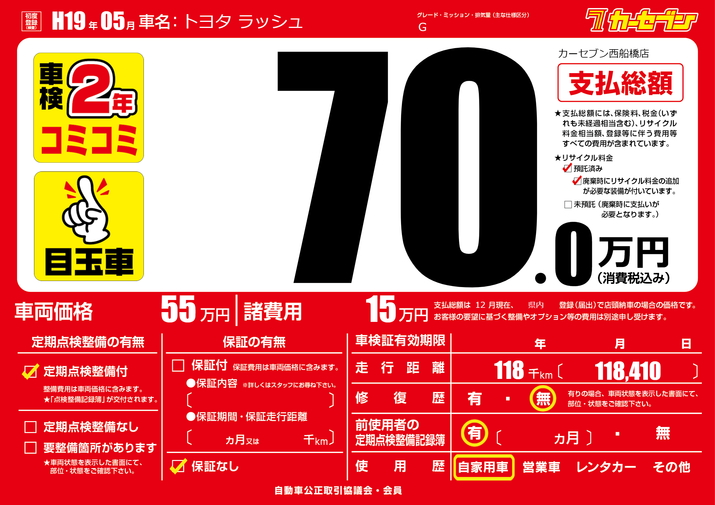 | 走行キロ | 11.8万km | 初年度登録 | H19年05月 |