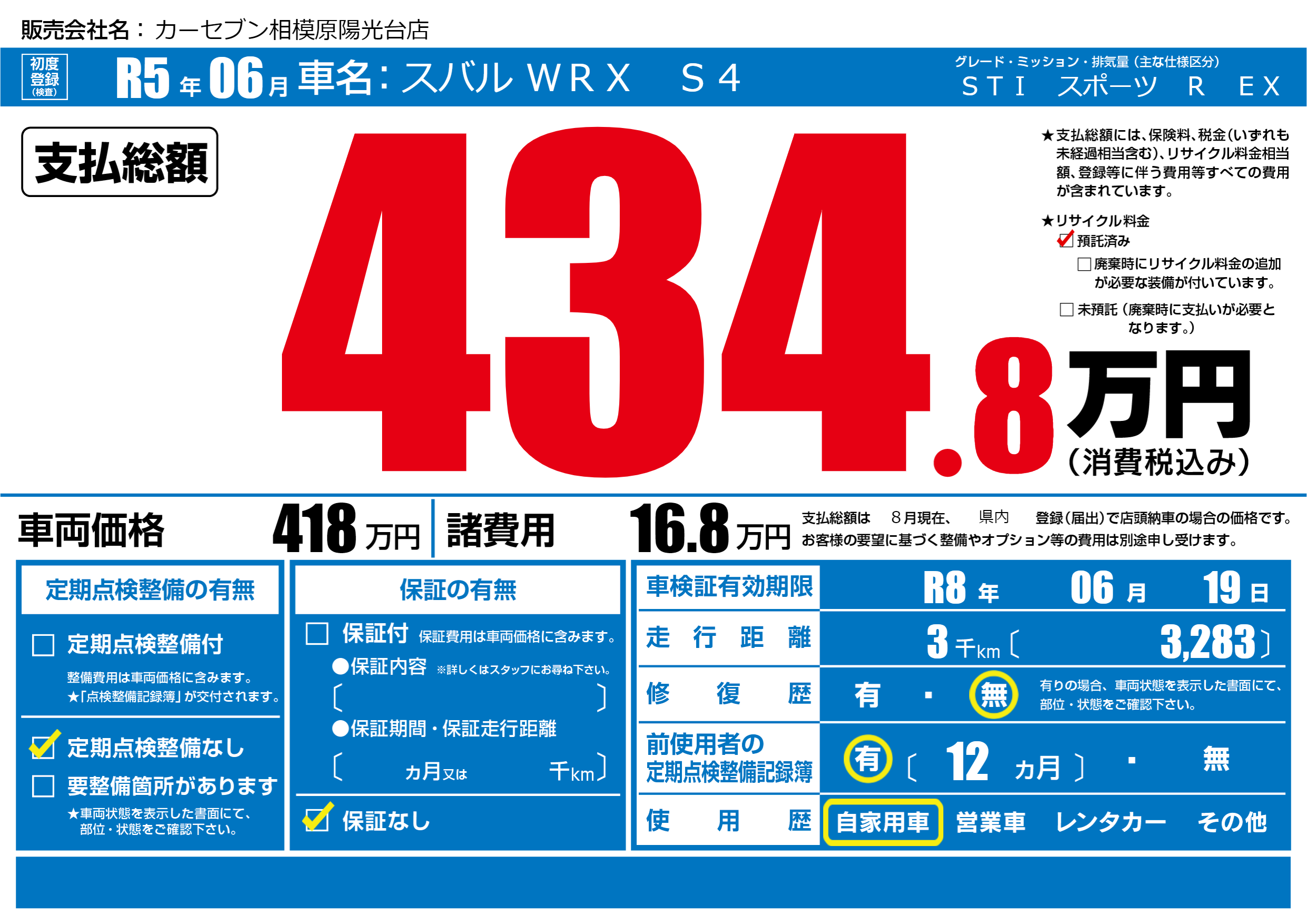 | 車名 | スバル WRX S4 | グレード ミッション 排気量 |