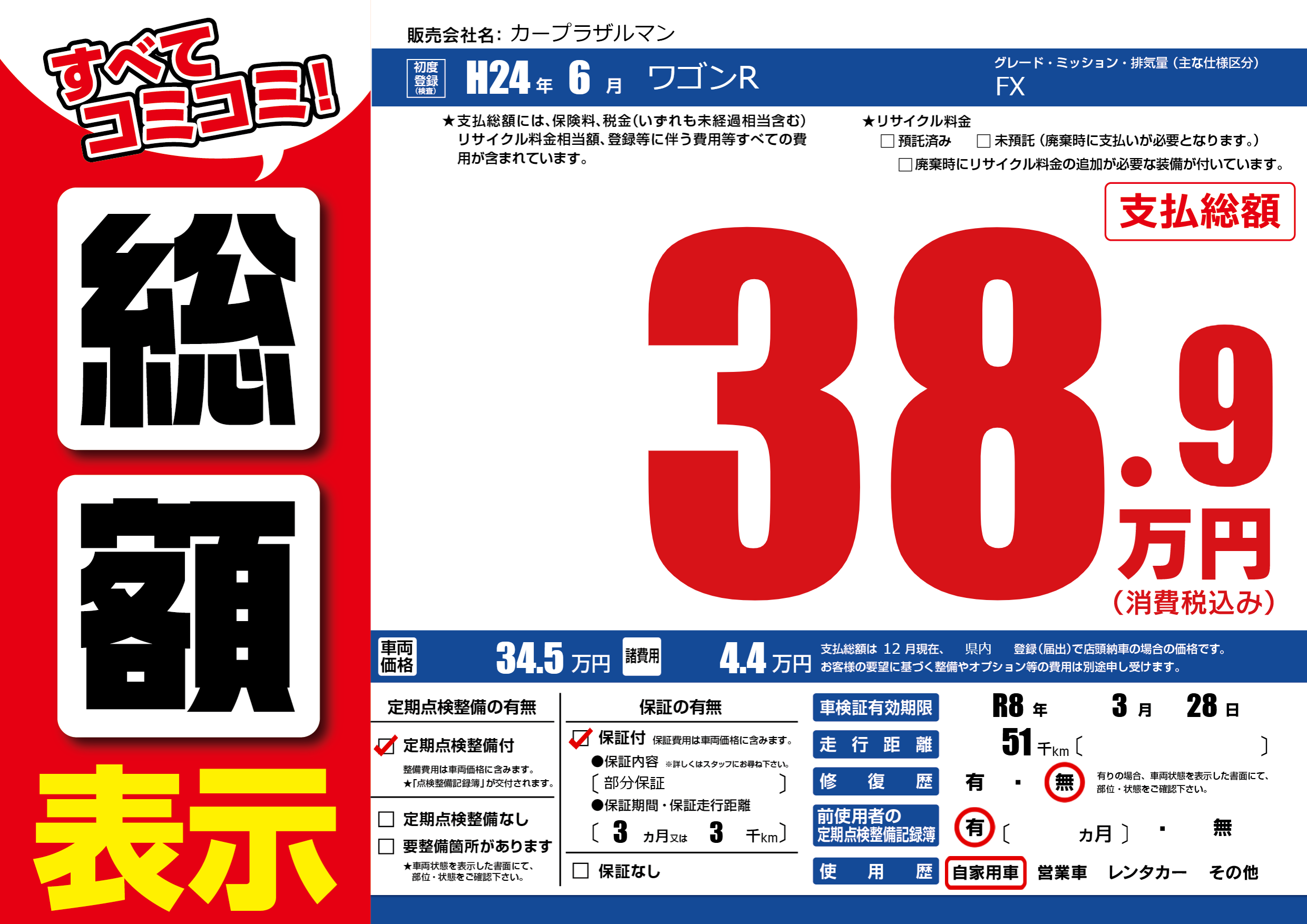 | 車名 | ワゴンR | グレード ミッション 排気量 |