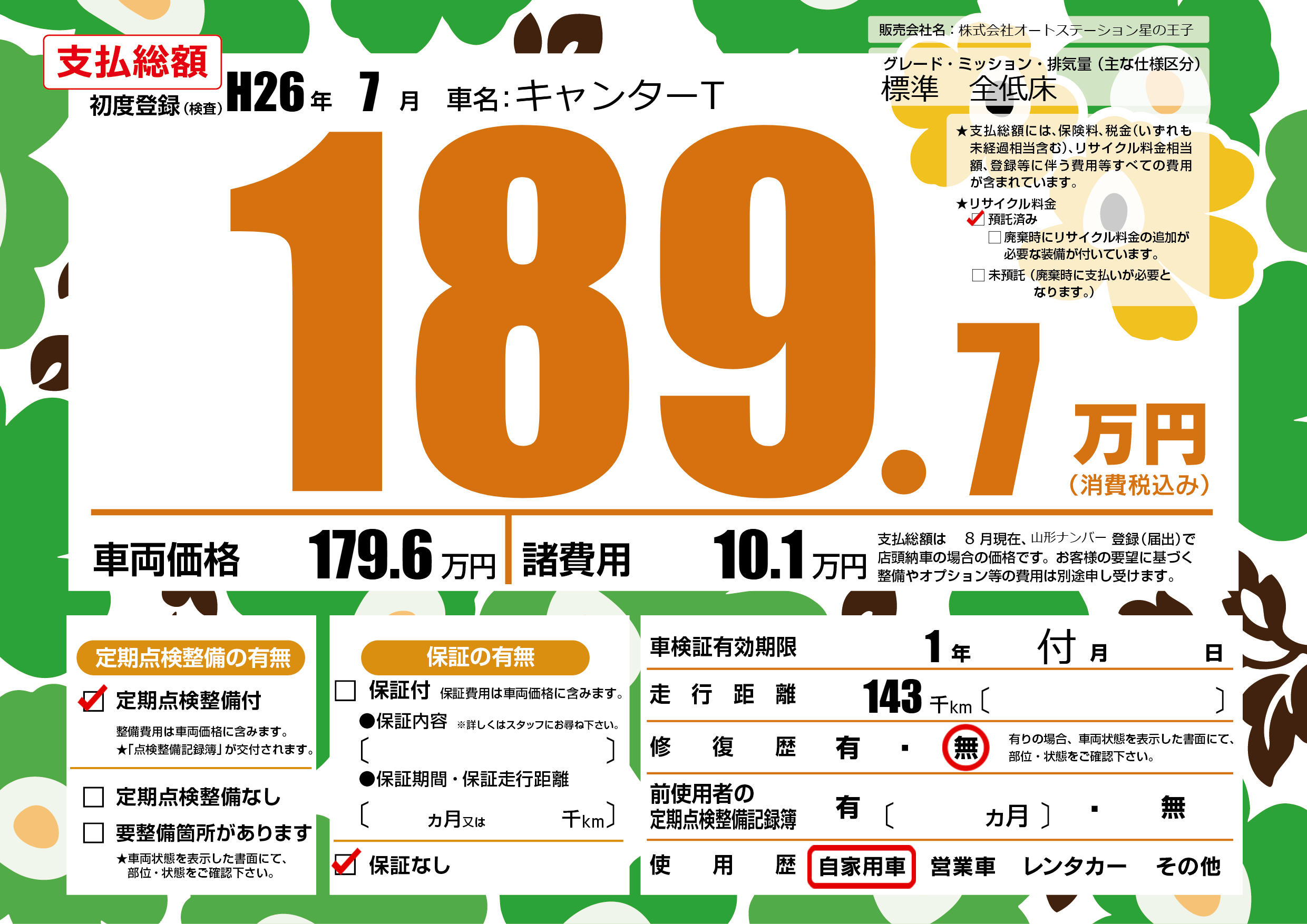 | 走行キロ | 14.3万km | 初年度登録 | H26年7月 |