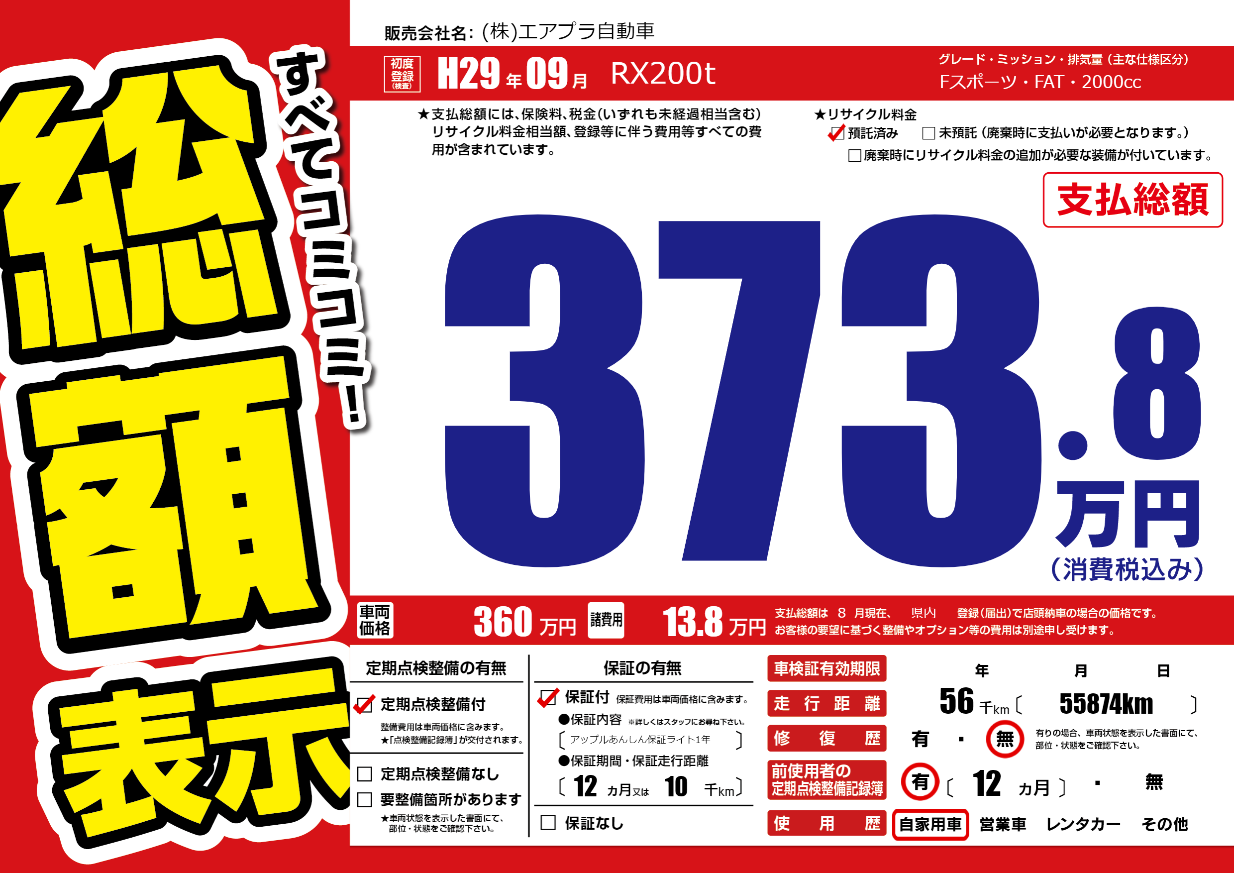 | 車名 | RX200t | グレード ミッション 排気量 |