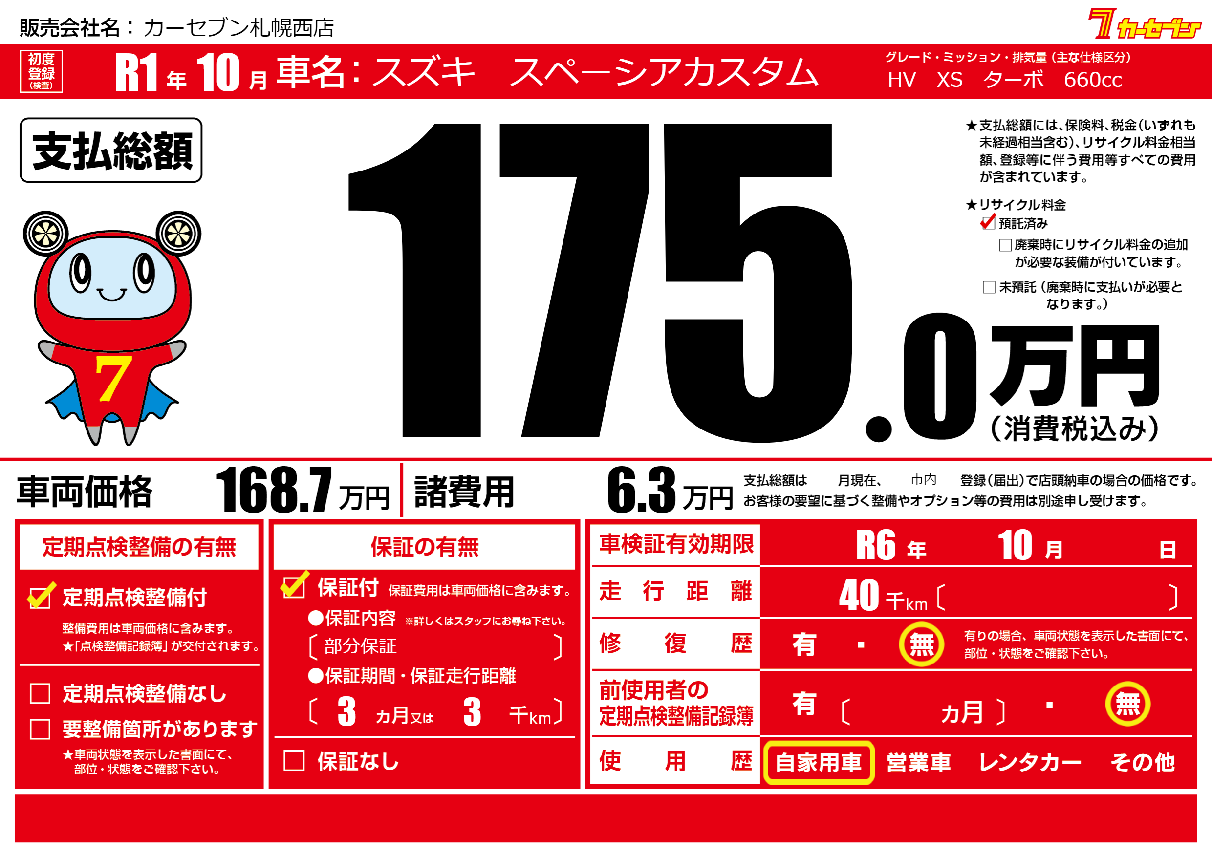 | 車名 | スズキ スペーシアカスタム | グレード ミッション 排気量 |