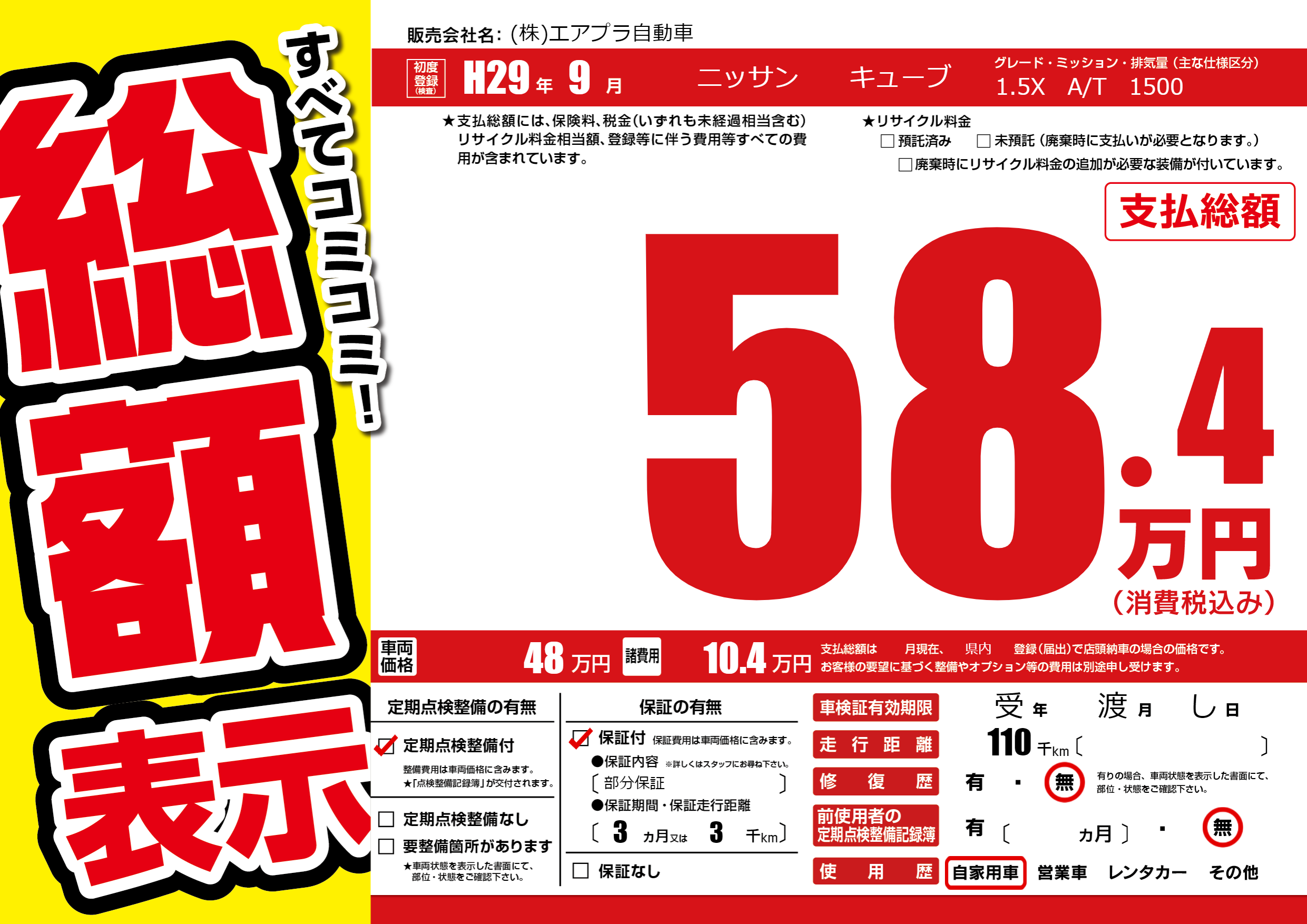 | 車名 | ニッサン キューブ | グレード ミッション 排気量 |