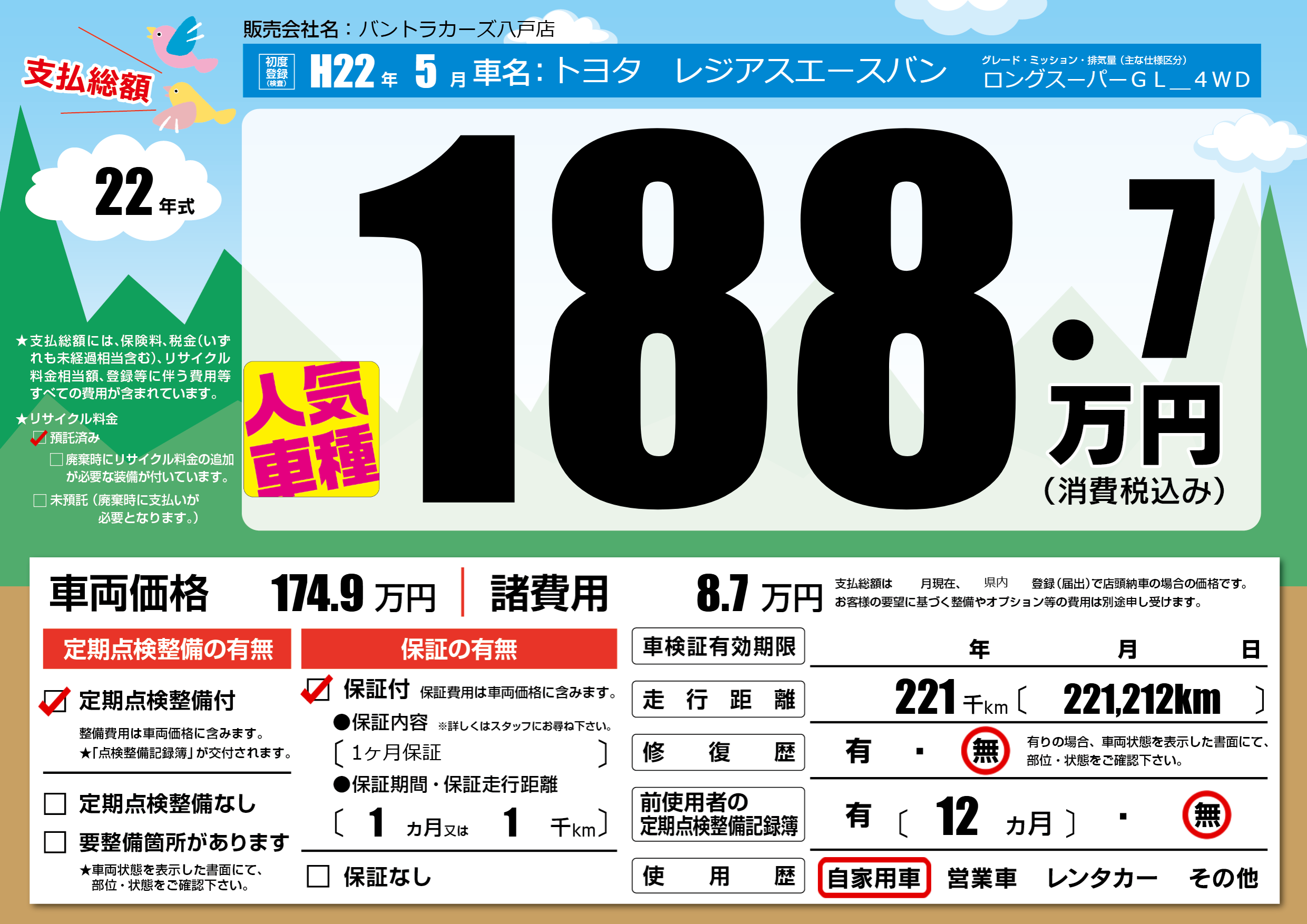 | 走行キロ | 22.1万km | 初年度登録 | H22年5月 |