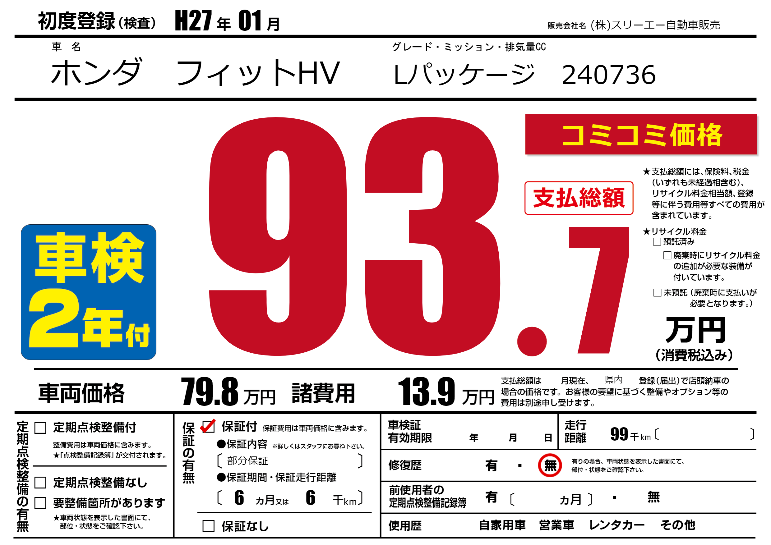 | 走行キロ | 9.9万km | 初年度登録 | H27年01月 |