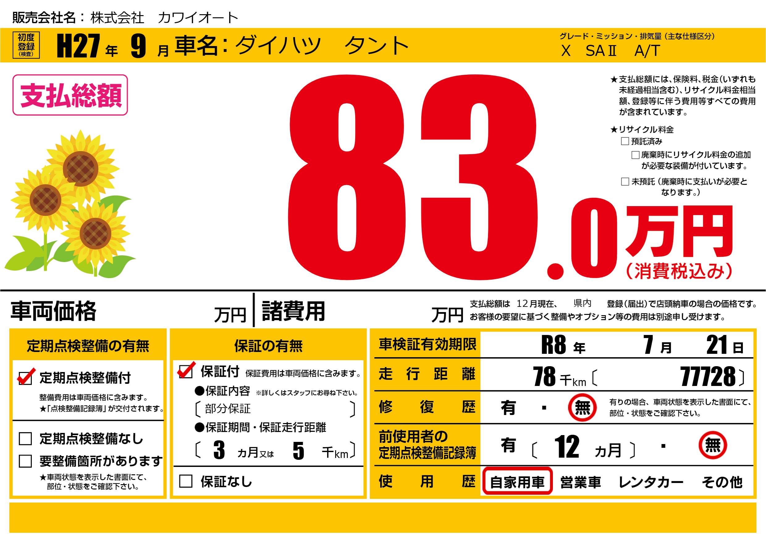 | 走行キロ | 7.8万km | 初年度登録 | H27年9月 |