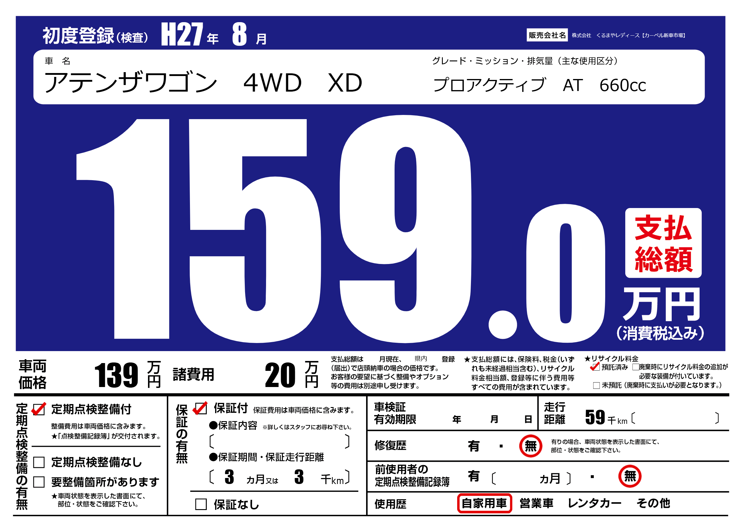 | 走行キロ | 5.9万km | 初年度登録 | H27年8月 |