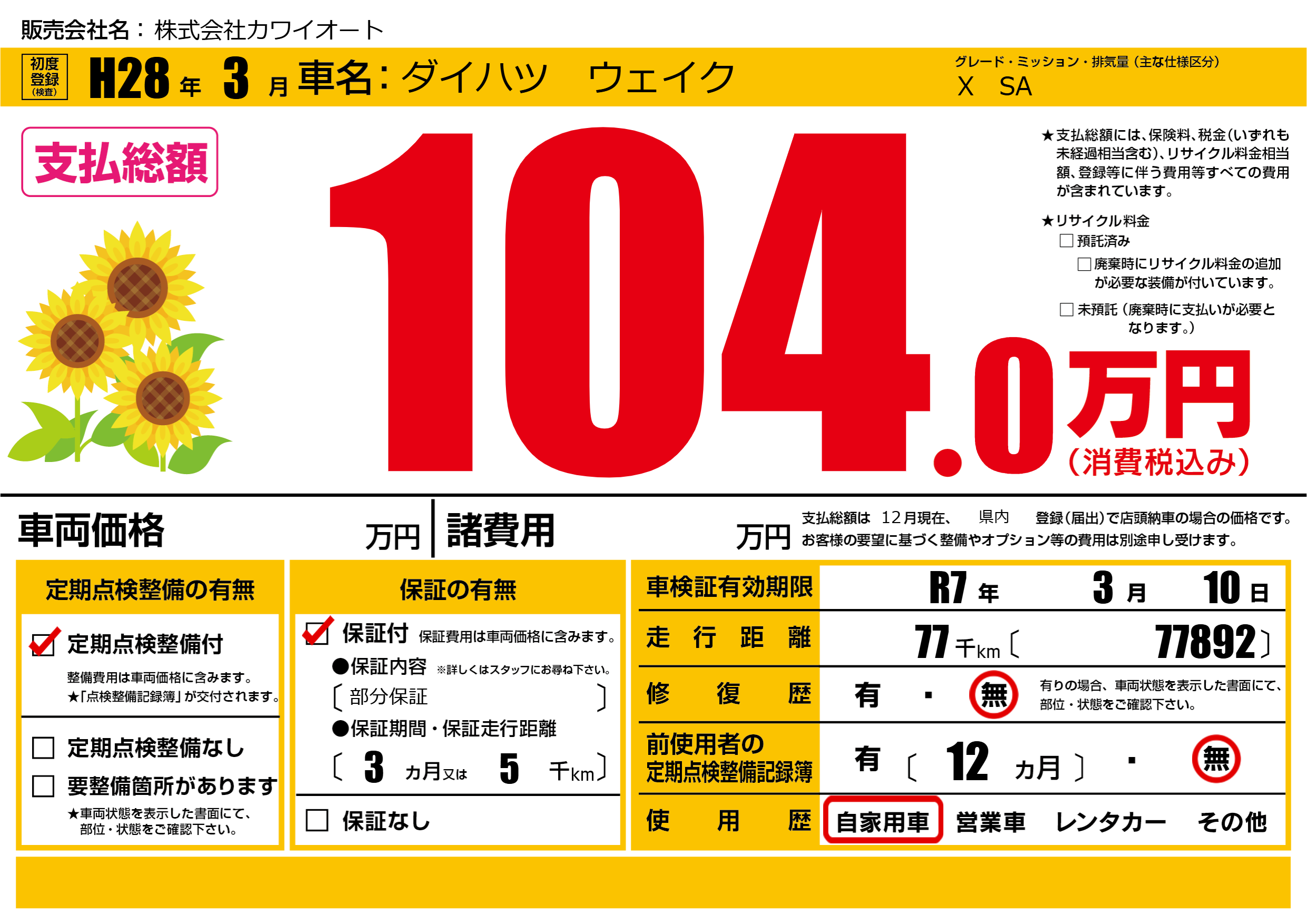 | 走行キロ | 7.7万km | 初年度登録 | H28年3月 |