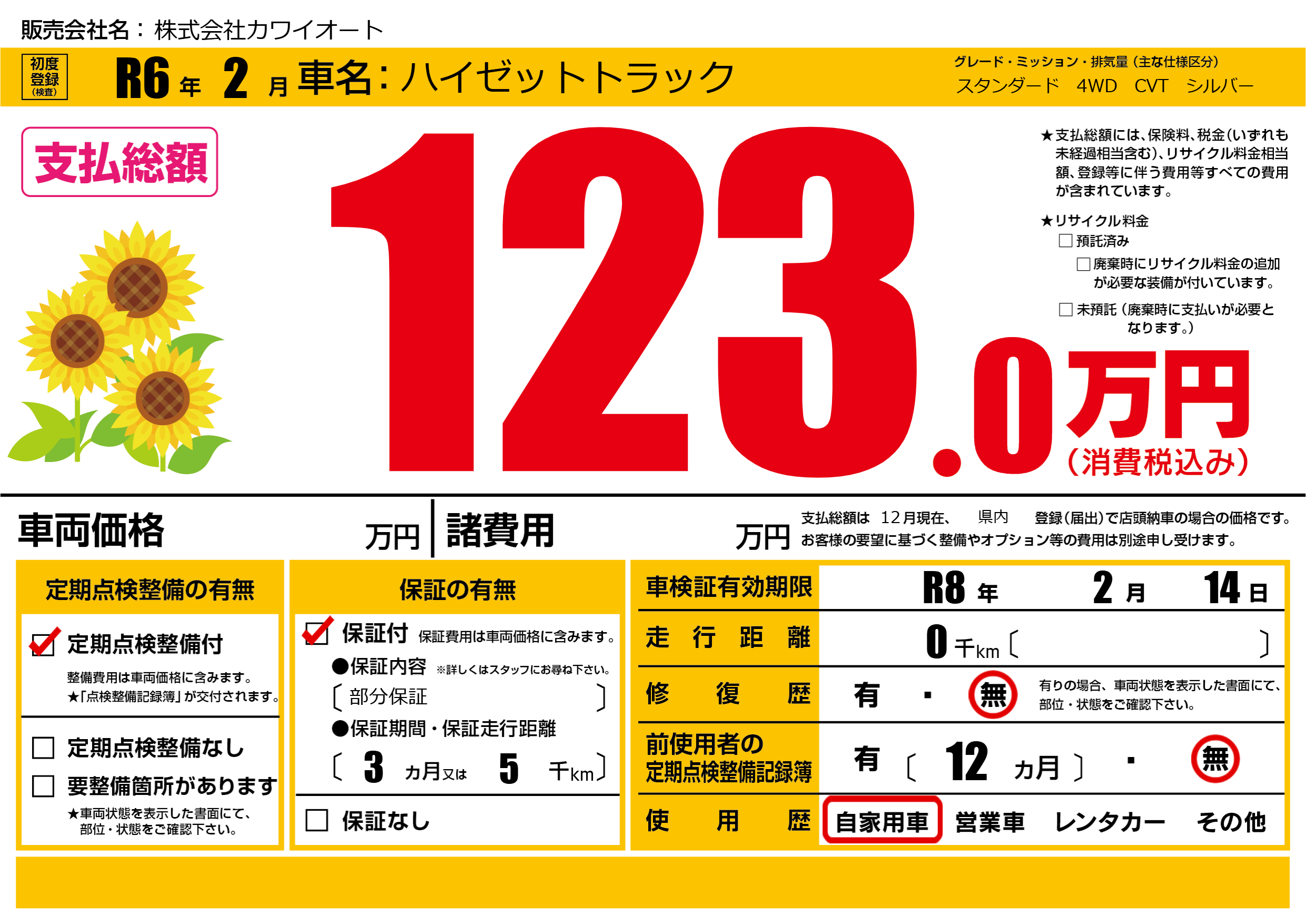 | 車名 | ハイゼットトラック | グレード ミッション 排気量 |