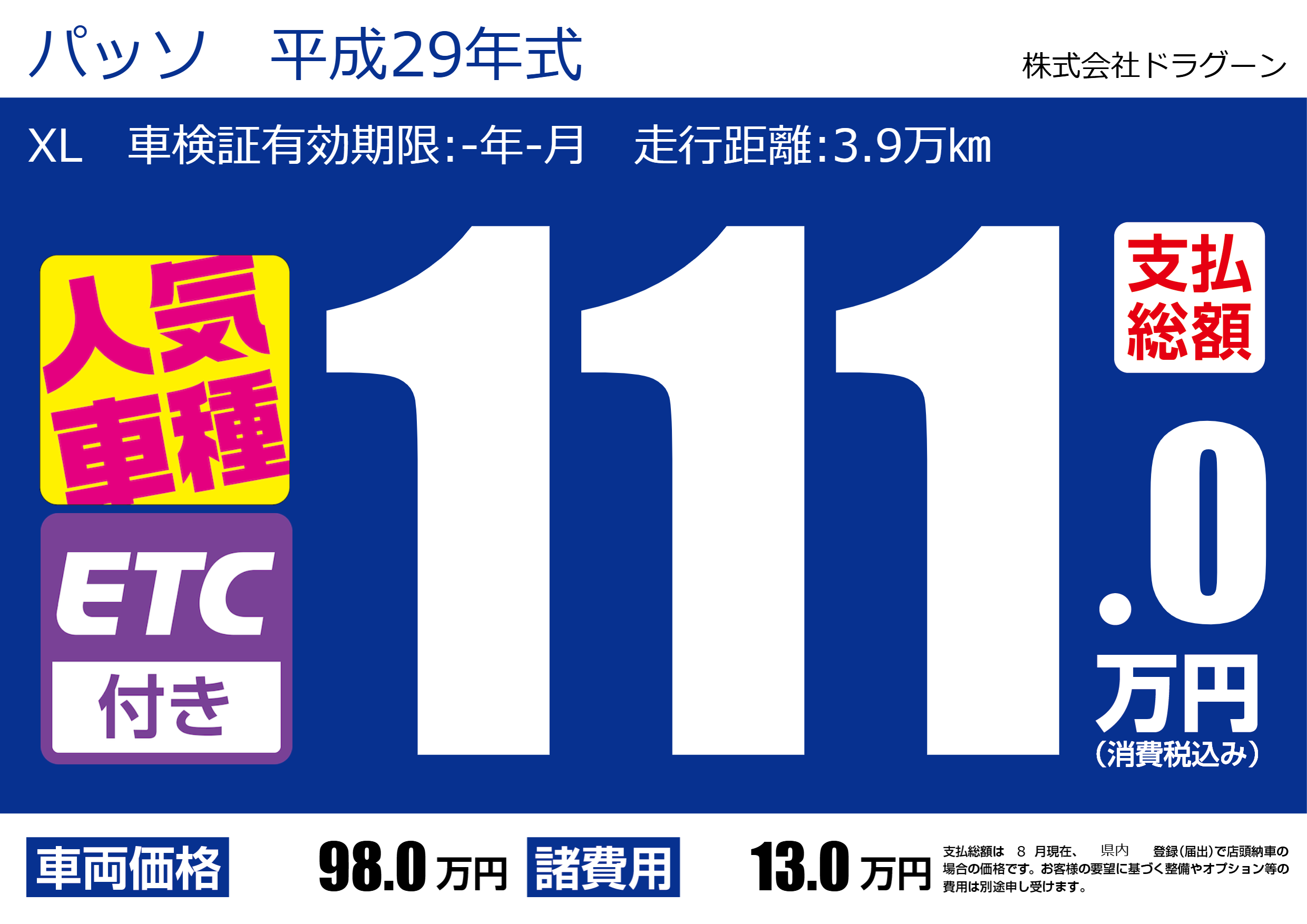 | 車名 | パッソ 平成29年式 | グレード ミッション 排気量 |