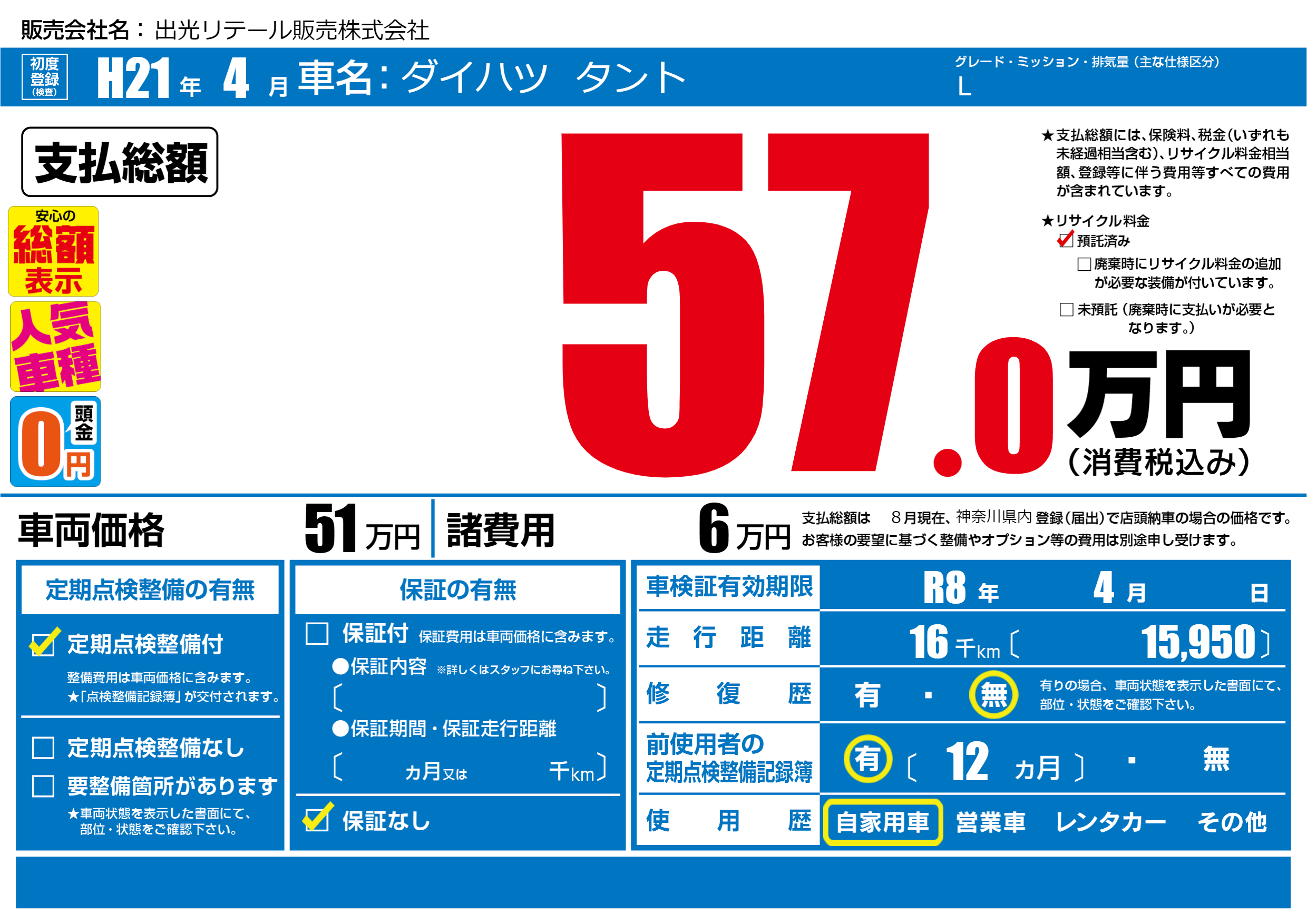 | 車名 | ダイハツ タント | グレード ミッション 排気量 |