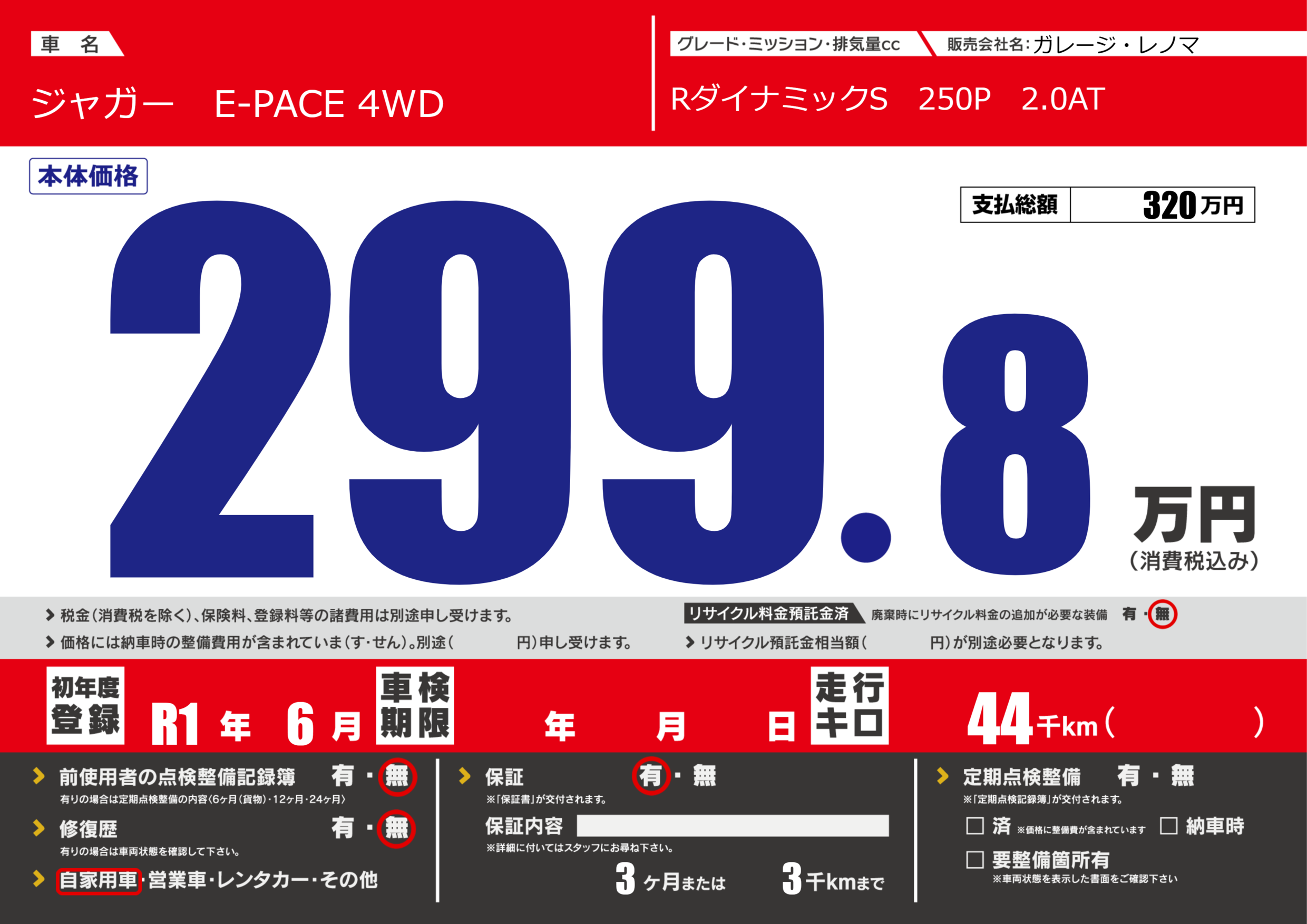 | 車名 | ジャガー E-PACE 4WD | グレード ミッション 排気量 |