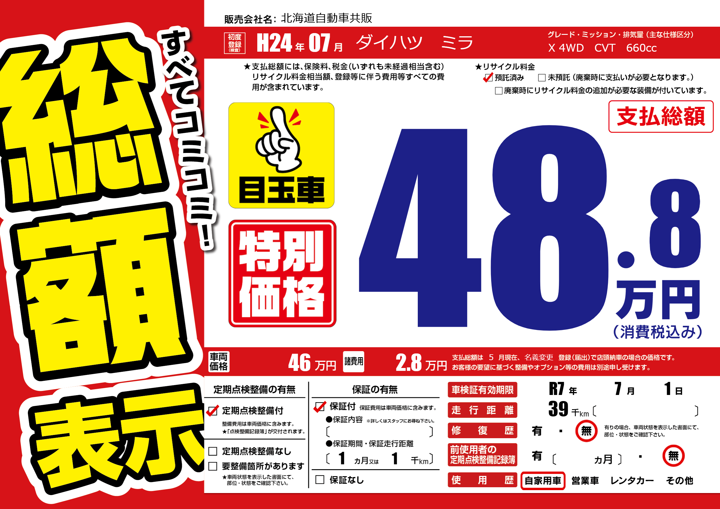 | 走行キロ | 3.9万km | 初年度登録 | H24年07月 |