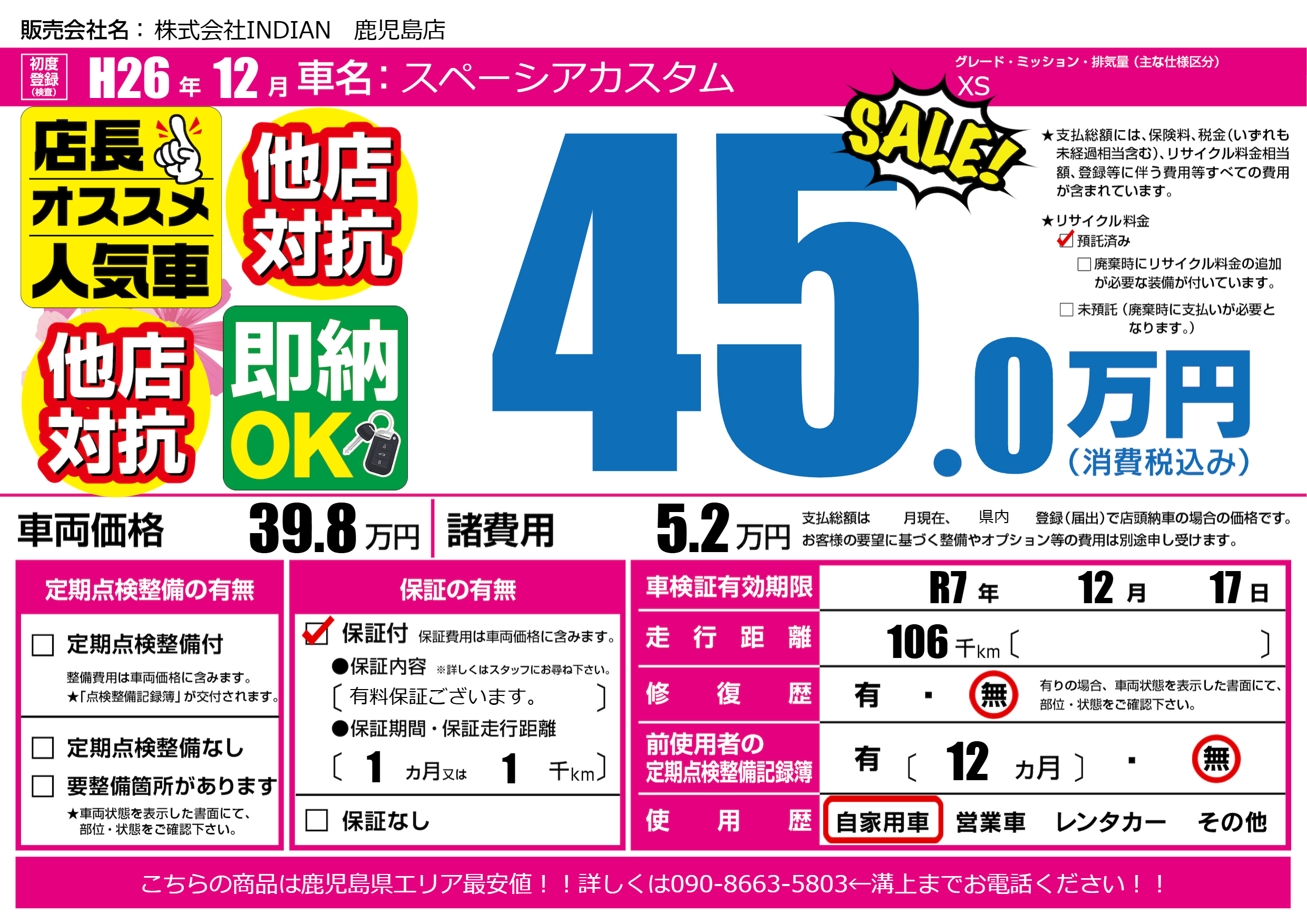 | 走行キロ | 10.6万km | 初年度登録 | H26年12月 |
