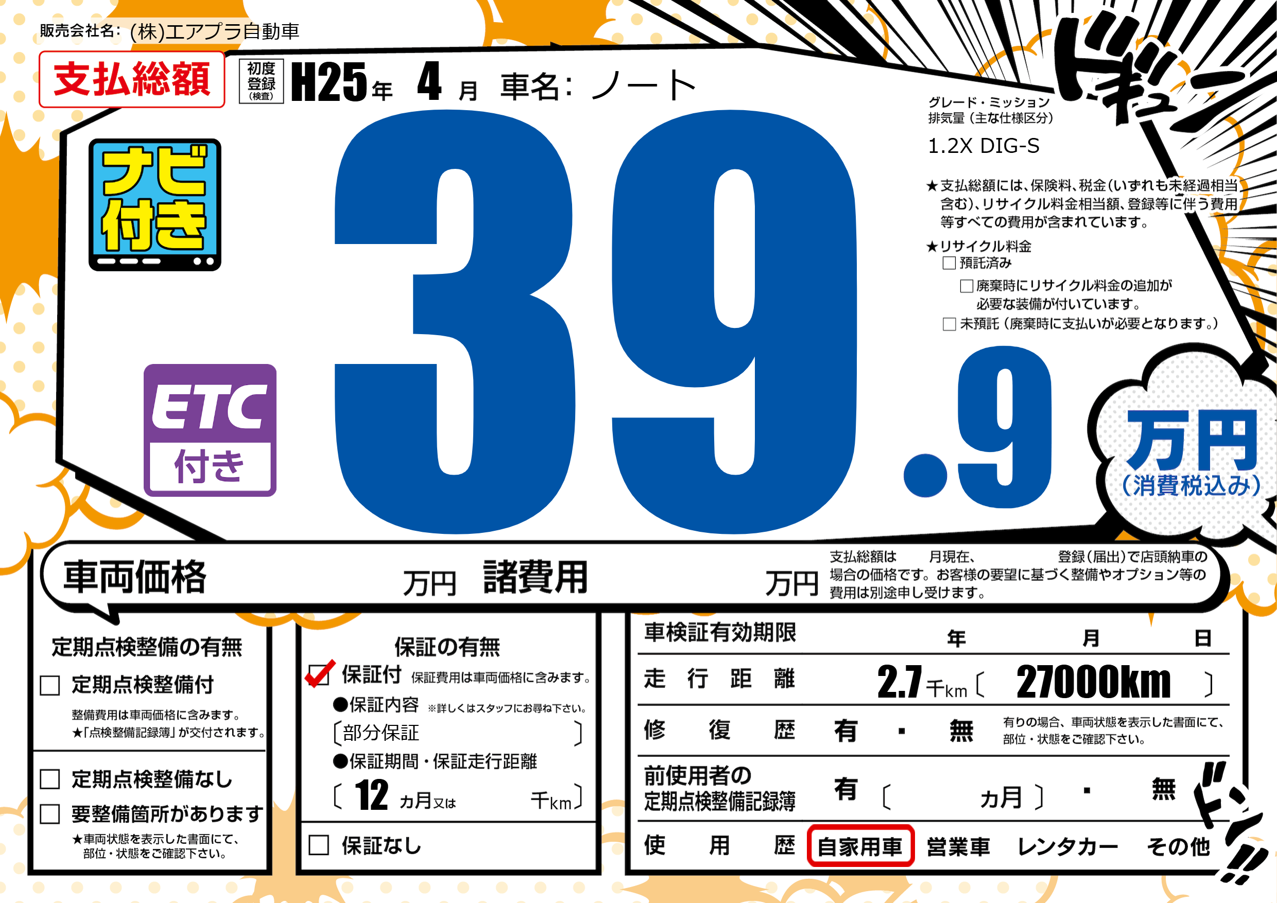 | 走行キロ | 0.2万km | 初年度登録 | H25年4月 |