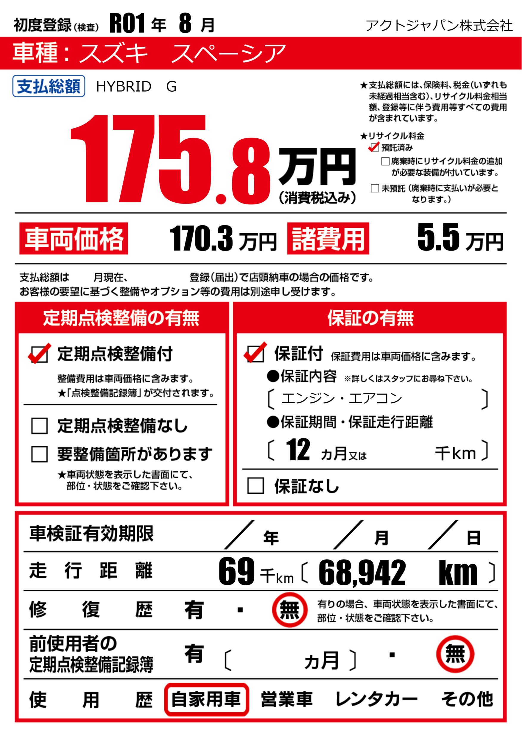 | 車名 | スズキ スペーシア | グレード ミッション 排気量 |