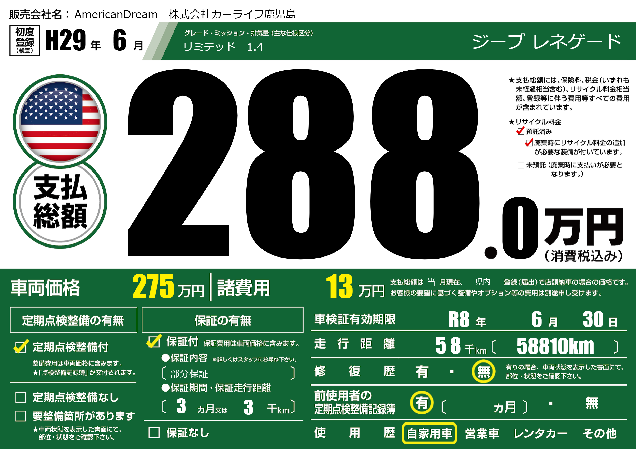 | 車名 | ジープ レネゲード | グレード ミッション 排気量 |