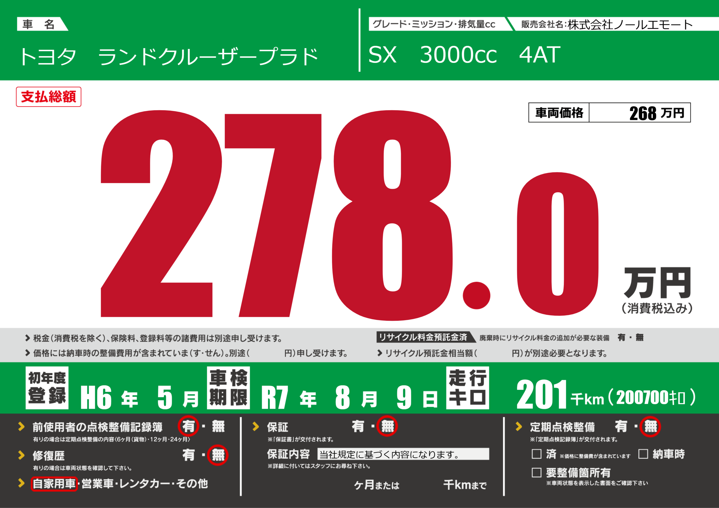 | 車名 | トヨタ ランドクルーザープラド | グレード ミッション 排気量 |